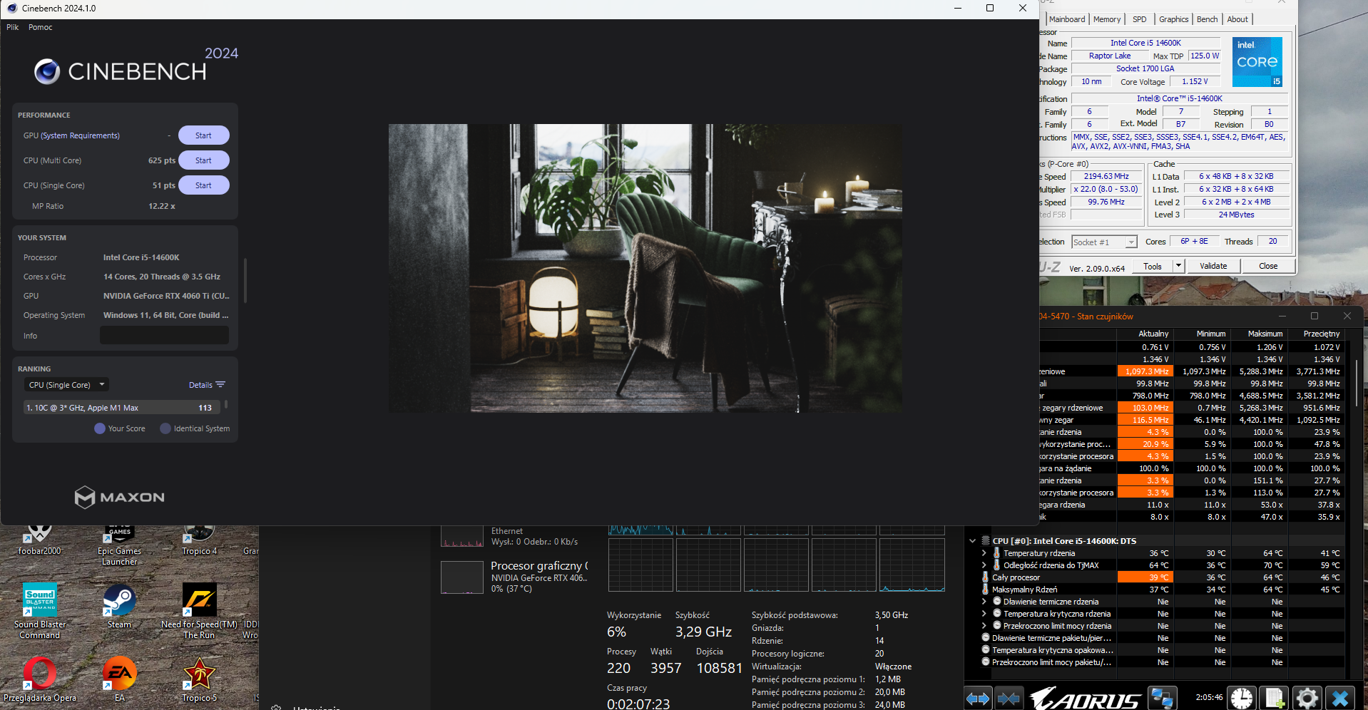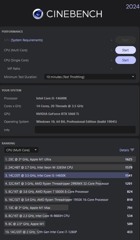 625 punktów na i5 14600K, w Cinebench 2024 multicore? Ja na i5 12400F w pełni standardowych ustawieniach (PL1=65W, PL2=117W, TAU=28, itd. itd.) miałem 665 punktów. Może masz pełno tych monitoringów odpalonych w tle i tak zjadło wynik? Tak czy inaczej, na standardowych ustawieniach (PL1=125W, TAU=56s, test 10 minutowy) to wynik powinieneś mieć dużo wyższy.