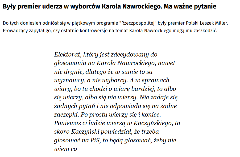 tymczasem komuch Miller też trafnie to podsumowuje - PiS to nie partia, PiS to wyznanie. Im nie trzeba ufać, w nich się ślepo wierzy.