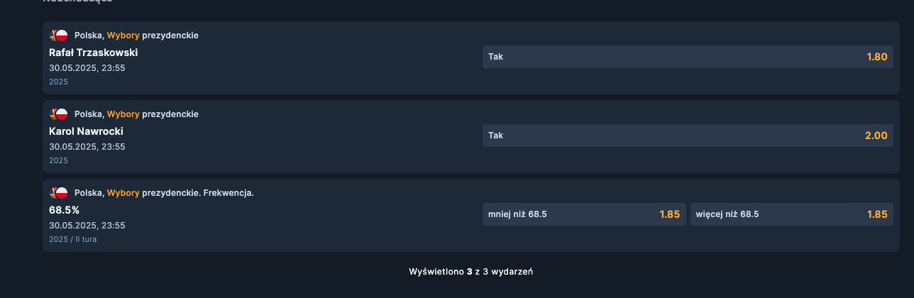 Zobaczymy co tu przewidzą w Polsce, niewykluczone, że będzie utrzymane większe prawdopodobieństwo wygranej Trzaskowskiego jak i również niewykluczone, że w pewnym momencie będzie mijanka i faworytem stanie się Batyr i końcowo te wybory według nich wygra i to trafią.
