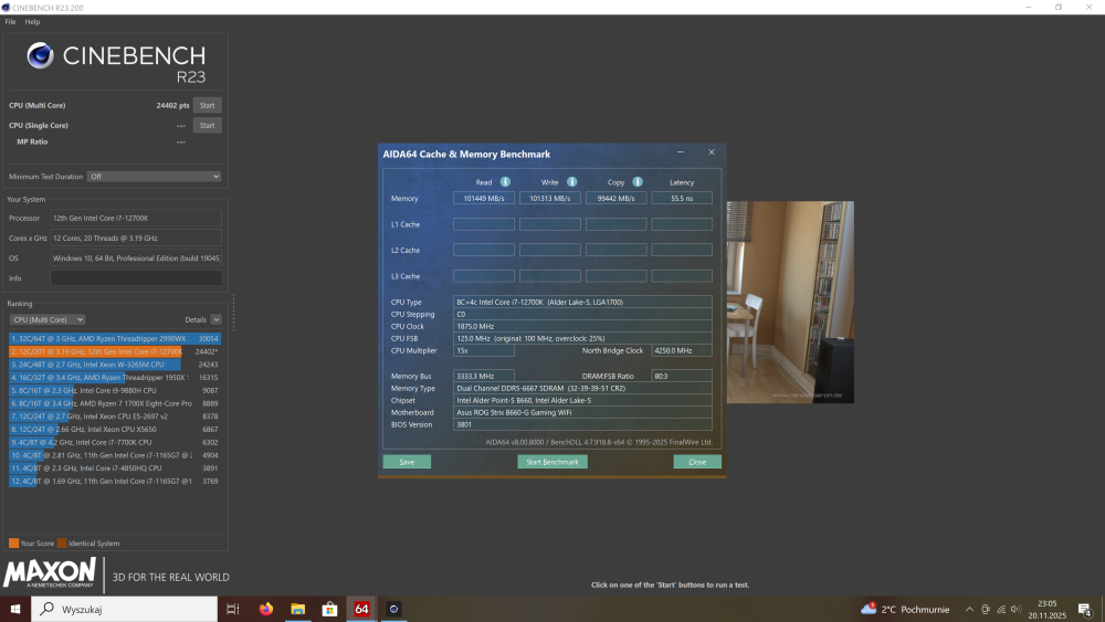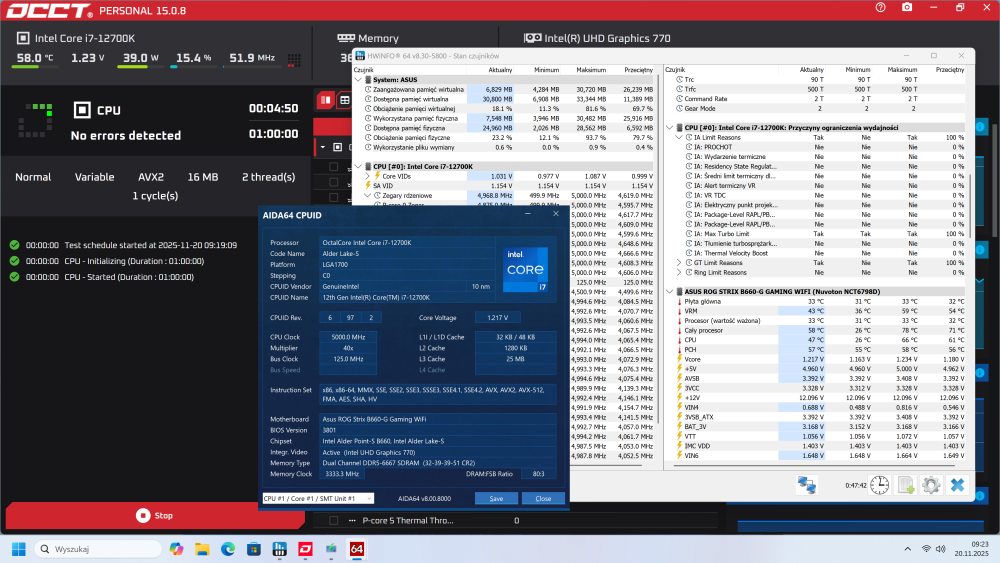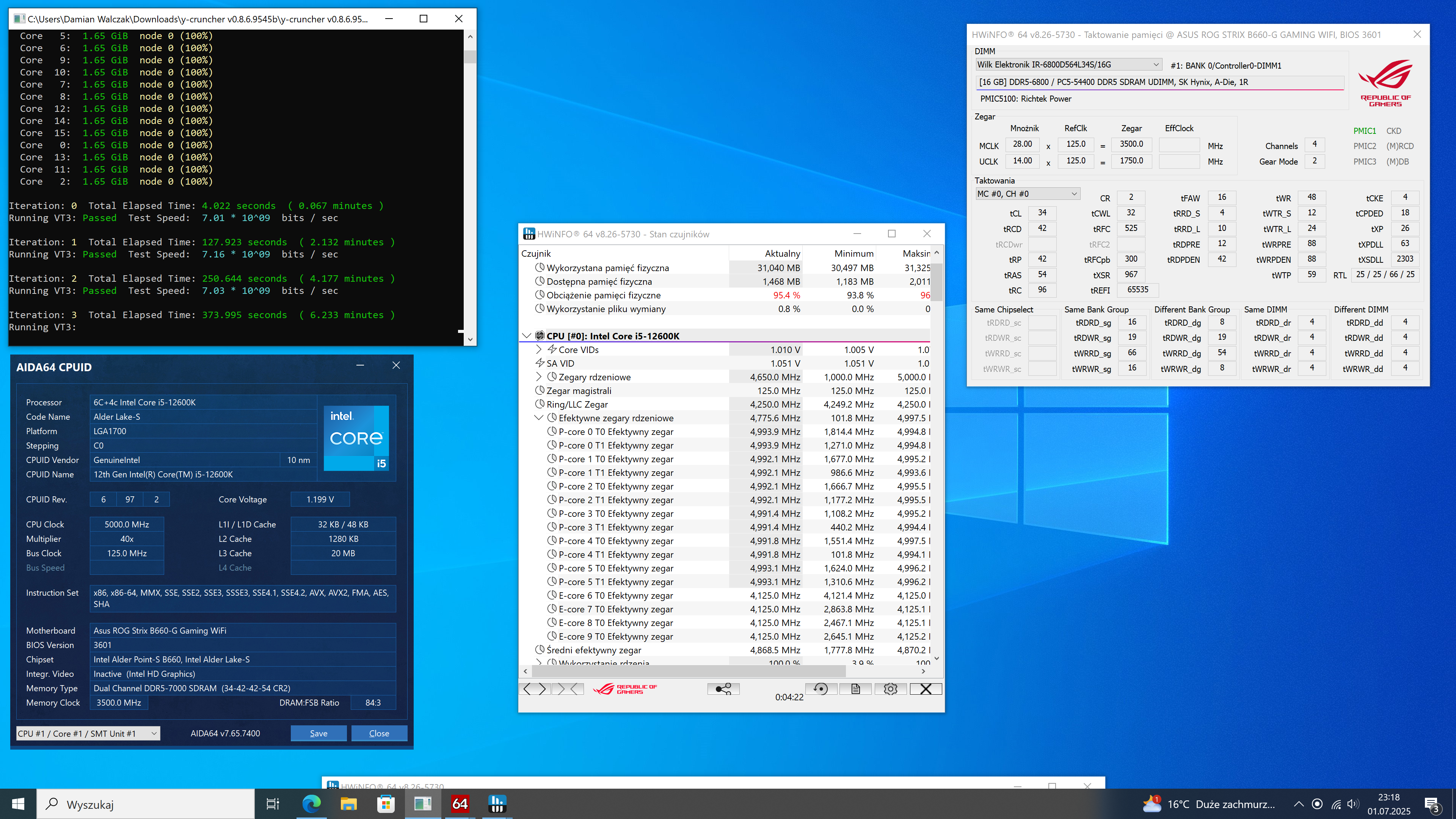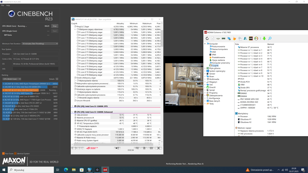 sert 89 Opublikowano 27 Maja Opublikowano 27 Maja (edytowane) W dniu 7.05.2025 o 18:52, wallec napisał(a): Jako właściciel nieśmiertelnego gen12 zakładam temat dla tych co chcą trochę ponarzekać albo i nie... Podpasowałeś mi z tematem..... Ja o 12600KF. Patrząc na pierwsze testy z 2021 roku na: - ITH https://ithardware.pl/testyirecenzje/intel_core_i5_12600k_test_procesora_alder_lake_mocny_zawodnik_w_sredniej_polce-18516-18.html , czytamy tam "Przechodząc do overclockingu, udało się uzyskać 5 GHz na dużych rdzeniach, 4 GHz na małych (...)" oraz - PPC https://www.purepc.pl/test-procesora-intel-core-i5-12600k-vs-amd-ryzen-5-5600x-wiecej-rdzeni-wiecej-wydajnosci-porownanie-pamieci-ddr4-i-ddr5?page=0,38 gdzie czytamy "Intel Core i5-12600K posiada odblokowane mnożniki, więc podkręcanie odbywa się w standardowy sposób, tylko można operować dwoma wartościami (niezależnie). maksimum co udało się ustabilizować to 5100 MHz dla wydajniejszych rdzeni i 4000 MHz dla energooszczędnych." Mamy jednak rok 2025.... a produkcja Intela 12gen w tym 12600KF .... idzie nadal pełną parą Nabyłem taki procesor wyprodukowany w 4 tygodniu 2025 roku. Moja płyta Z690 Taichi pokazała i uświadomiła mnie w biosie - co mnie totalnie zaskoczyło - że trafił mi się niezły "bin" (tak się chyba fachowo mówi?) Popatrzcie..., co Wy na to? Bo ja na to - stawiam tezę, że Intel produkuje w 2025 r. procesory 12gen o wiele lepszej jakości niż wcześniej, a już na pewno w porównaniu do 2021/2022 roku. C.D.N. Edytowane 27 Maja przez sert