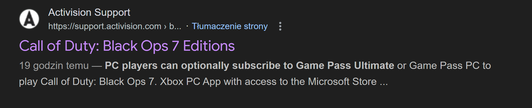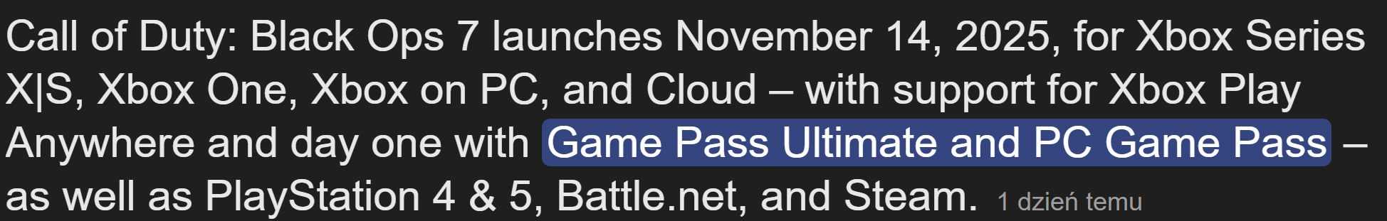 "To bardzo istotny szczegół, który wielu graczy mogło przeoczyć. Adnotacja pojawiła się jedynie w kilku miejscach, między innymi w mediach społecznościowych Xbox Game Pass, gdzie w stopce obrazka dodano drobny zapis: „*Excludes Call of Duty titles. **Requires Game Pass Ultimate”. Tymczasem spora część graczy zakładała, że nowa odsłona serii, jak inne premiery „Day One”, trafi także do niższych progów subskrypcji."