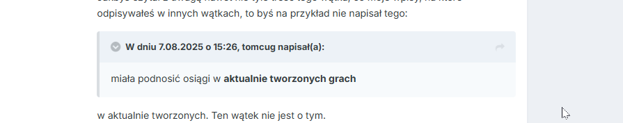 VRman 2 635 Opublikowano 8 Sierpnia Autor Opublikowano 8 Sierpnia Przecież odpisując pogrubiłem o co chodzi. Drugą podstronę już marnujemy bez choćby jednego posta na temat. Eh.. @ITHardwareGPT Zrób czytelne streszczenie treści wątka dla leniuchów. Streść o co chodzi w tym co ja piszę i co pisało zacytowane przeze mnie AI. Pogrub to, gdzie mowa o sprawach technicznych. Możesz też kilka spraw połączyć, jeśli pozwoli to przedstawić informacje bardziej spójnie i zrozumiale. 1