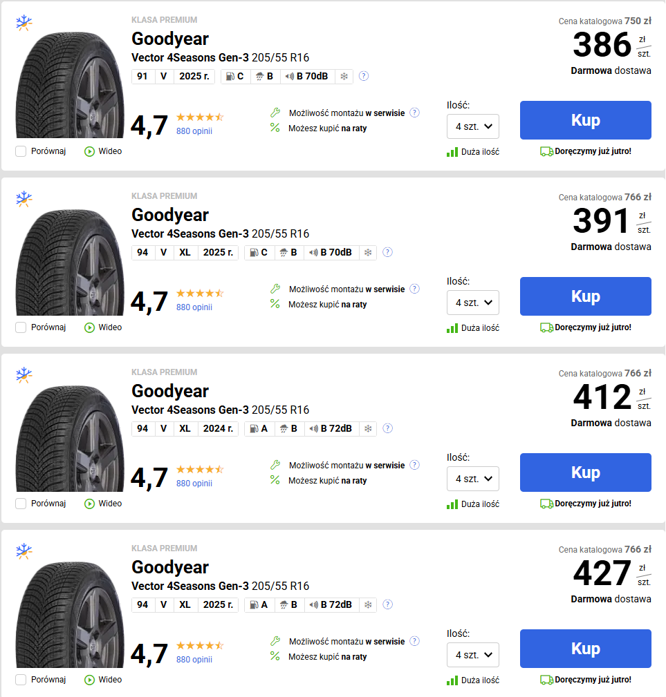 Przede wszystkim polecający opony do konkretnego modelu nie ma sensu podawanie go bez indeksów. Wbrew pozorom ma to znaczenie, bo taki goodyear 4Seasons Gen3 nie występuje w 91H.