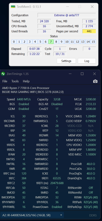 terminus 7 Opublikowano 27 Lipca Opublikowano 27 Lipca Cześć Proszę o poradę. Mam nowy komputer, ryzen 7700 + płyta asus b650e max gaming wifi + 2x16GB ram ddr5 6000 cl30, rx9070xt, limit mocy ryzena 88W i po zainstalowaniu windowsa iot lsct zacząłem go trochę testować i nie do końca coś mi się zgadza. Niepokoi mnie dość niski wynik w cinebench r23. Na stock - bez zmiany w biosie niczego dostaję 18500 - zegary obserwowane w hwinfo około 4850MHz, jak w biosie w ai overcloking tuning ustawię pamięci na expo I lub expo tweaked to mój wynik w cinebench r23 spada do 18320 - zegary procesora podczas testu około 4750MHz czyli około 100MHz mniej. Uruchomiłem u siebie ryzen mastera i po 1,5 godzinnym kręceniu zaproponował -50 na każdy rdzeń. Zmieniłem to na -48 - tyle było stabilne po 2h w prime95 i teraz podczas testu cinebench zegary minimalnie przekraczają 5GHz i wynik to 19373. Co robię nie tak? Czy te wyniki nie powinny być wyższe? Skąd takie szalone propozycje -50 na wszystkich rdzeniach i czemu mi tak słabo boostują rdzenie? Zdecydowanie limitem jest limit mocy. Temperatura na procesorze nie przekracza 65 stopni. Sterowniki wszystkie zainstalowane poprawnie.