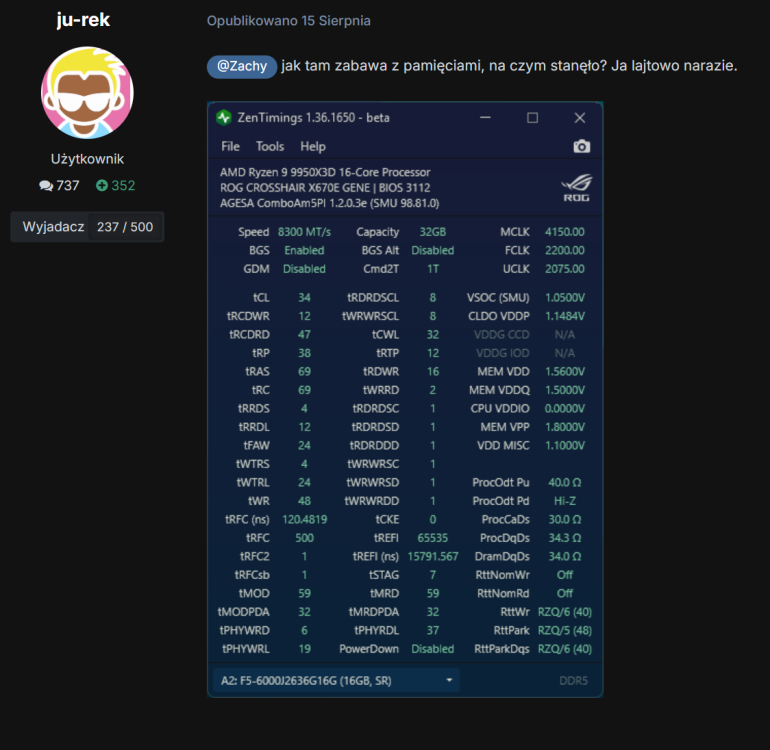 terminus 7 Opublikowano 28 Lipca Autor Opublikowano 28 Lipca (edytowane) 13 minut temu, Phoenix. napisał(a): Manualne nastawy na ryzenach to najgorsze co moze byc Bo ustawiajac cpu pod syntetyka zawsze stracisz zegary w grach. Zauważyłem to. Docelowo pewnie zostawię optymalizację na krzywych. To powyżej raczej dla zabawy, w sumie fajniejsze niż granie Ale notatki prowadzę gdybym jednak zmienił zdanie Edytowane 28 Lipca przez terminus