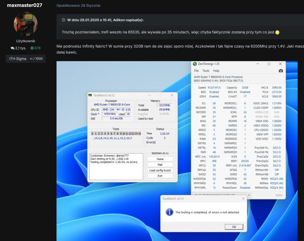 terminus 7 Opublikowano 28 Lipca Autor Opublikowano 28 Lipca (edytowane) Na razie doszedłem do tego punktu: power limit 88W, temperatura nie przekracza 65 stopni, curve offset -48 all cores, fclk 2200, core soc 1,1V, pamięci - profil EXPO TWEAKED na pycie asusa (niestety chyba trafiły mi się m-die, mogę w sumie jeszcze je oddać ale nie wiem czy a-die wiele zmieni)- badanie stabilności - kilkugodzinne testy w aida64, prime95, testmem5 - pewnie to mało ale do komputera do gier i zabawy chyba wystarczy Fajnie by się było otrzeć o 20 tyś - jak ktoś widzi jeszcze pole do poprawy bez znaczącego spadku stabilności to chętnie przyjmę porady. Core soc niżej nie próbowałem - AI twierdzi, że jestem na granicy. Godzinę temu, krzysiek_1990 napisał(a): Zrób se tak jak ja według filmu i walnij 5000. W cinebenchu będziesz miał 18400-18700. Napięcie będzie w okolicy 1.1v i będzie ppt dobijać do 88w. W grach mam 45-50 stopni. Cinebench 70 stopni. Shadery 75 stopni. Szkoda sprzętu żylować na jakieś syntetyki. Ew zabawa z CO + vsoc (1.15-1.2). Albo w biosie mnożnik zmniejsz mam to przetestowane wcześniej, niestety albo coś robię nie tak albo mam dziadowski procesor - u mnie jest tak: stabilne mam 5GHz, 1,07V, 113W, 74c w syntetyku (prime95) Edytowane 28 Lipca przez terminus