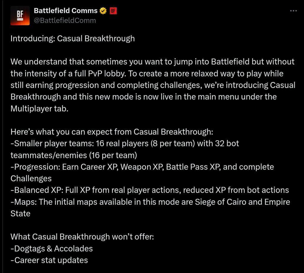 W #BF6 dodano tryb "casual Breakthrough”, prawdopodobnie z tego powodu, że ostatnio społeczność Battlefielda narzekała na dobrych graczy. Community BFa nie lubi jak ktoś dobrze gra