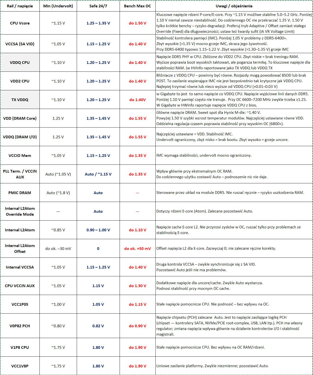ITHardwareGPT 787 Opublikowano 24 Września Opublikowano 24 Września @ITprospector Poniżej masz gotowy plik CSV (kodowanie UTF‑8, średniki) z Twoją najnowszą rewizją. W Excelu PL powinno się zaimportować bez problemu. Gdyby coś nie tak z polskimi ogonkami – daj znać. ``` "Rail / Napięcie";"Min (Undervolt)";"Safe 24/7";"Bench / Max OC";"Uwagi / objaśnienia" "CPU Vcore";"~1.15 V";"1.25 – 1.35 V";"do 1.50 V";"Kluczowe napięcie rdzeni P-core/E-core. Przy ~1.15 V możliwe stabilne 5.0–5.2 GHz. Poniżej 1.10 V niemal zawsze niestabilność. Do codziennego OC nie przekraczać 1.35 V. A 1.50 V tylko krótkie benchy – ryzyko degradacji. Preferuj tryb Adaptive / Offset zamiast stałego Override (Fixed) dla długowieczności; ustaw też twardy sufit (IA VR Voltage Limit 1.40–1.45 V)." "VCCSA (SA VID)";"~1.05 V";"1.20–1.30 V (≤1.35 V)";"do 1.40 V";"Stabilność kontrolera pamięci (Stabilność IMC/PCIe/iGPU). Poniżej 1.05 V problemy z DDR5-6400+. Zbyt wysokie (>1.35 V) mocno grzeje IMC, skraca jego żywotność. Przy DDR5-6400 typowo zakres 1.15–1.22 V." "VDDQ CPU";"~1.10 V";"1.20 – 1.35 V";"do 1.45 V (Bench 1.50 V)";"Napięcie DDR5 PHY w CPU. Zbliżone do VDD2 CPU. Zbyt niskie = brak treningu RAM. Wyższe poprawia boot wysokich taktowań, ale pogarsza termikę. To kluczowe napięcie dla stabilności RAM od >6400MHz (w HVInfo raportowane jako VDDQ TX lub TX VDDQ)." "VDD2 CPU";"~1.10 V";"1.20 – 1.35 V";"do 1.45 V (Bench 1.50 V)";"Bliźniacze z VDDQ CPU – powinny być równe. Rozjazdy mogą powodować BSOD lub brak POST. To zasilanie wspierające IMC nie jest bezpośrednio tak krytyczne jak VDDQ CPU. Najlepiej trzymać równe lub nieco wyższe od VDDQ CPU (+0.01–0.03 V)." "VDDQ TX (TX VDDQ)";"~1.10 V";"1.20 – 1.35 V";"do 1.45 V (Bench 1.50 V)";"W Gigabyte to jest to samo napięcie co VDDQ CPU. Napięcie wyjściowe linii danych DDR5. Poniżej 1.10 V pamięć często nie trenuje. Przy OC 6600–7200 MHz zwykle trzeba ≥1.25. W Gigabyte w HWInfo raportuje jako napięcie „VDDQ TX” lub „IVR Transmitter VDDQ”." "VDD Mode / VDD A0, A1,B0, B1 voltage";"1.25 V";"1.35 – ≤1.45 V";"do 1.55 V";"Główne napięcie DRAM. Sweet spot dla Hynix M-die: ~1.40 V. >1.45 V tylko z aktywnym nawiewem na moduły. Powyżej 1.45 V szybki wzrost temperatur. Najczęściej ustawiane równe VDD. Oddzielna regulacja czasem poprawia stabilność przy wysokim OC (6800+)." "VDDQ Mode / VDDQ A0, A1,B0, B1 voltage";"1.25 V";"1.35 – ≤1.45 V";"do 1.55 V";"Najczęściej ustawiane = VDD. Stabilność IMC. Undervolt ograniczony, zbyt nisko = brak bootu. Zbyt wysoko = grzeje uncore." "VPP Mode A0, A1,B0, B1 voltage";"Auto";"1.80 V";"1.80 V";"Służy wyłącznie do zasilania wewnętrznych układów sterowania bramek tranzystorów w matrycy pamięci. Nie wpływa bezpośrednio na taktowanie, timingi czy stabilność, tak jak VDD/VDDQ. Umożliwia wybór komórek pamięci w macierzy DRAM." "Internal L2Atom Override Mode";"AUTO";"Auto";"AUTO";"Dotyczy rdzeni E-core (Atom). Zalecane pozostawić Auto." "Internal L2Atom";"~0.85 V";"0.90 – 1.00 V";"do 1.10 V";"Napięcie cache E-core L2. Nie przynosi zysków w OC, ruszać tylko przy problemach ze stabilnością E-core." "Internal L2Atom Offset";"do ok. –30 mV";"0";"do ok. +50 mV";"Offset napięcia L2 dla E-core. Zazwyczaj 0; nie zalecane ręczne korekty." "Internal VCCSA";"~1.05 V";"1.15 – 1.25 V";"do 1.40 V";"Druga kontrola VCCSA – zwykle synchronizuje się z SA VID. Pozostawić Auto jeśli nie ma problemów." "CPU VCCIN AUX";"Auto ~1.80 V";"1.80–1.90 V";"1.90 V (Bench ≤1.95 V)";"Wejście FIVR (CPU AUX). Trzymaj ~+0.40 V ponad najwyższy rail FIVR (SA/VDDQ/L2). Nie mylić z PLL Term. Gigabyte nazywa go VCCIN AUX, ale w HWInfo znajdziesz go czasem jako V1P8 CPU albo VCC1V8P. To pomocnicze zasilanie (~1.8 V) dla uncore/cache/PLL; nie poprawia wydajności RAM, zapewnia stabilność „otoczki” CPU." "VCC1P05";"0.85–1.00 V";"1.05 V";"do 1.15 V";"Stałe napięcie pomocnicze CPU. Nie podnosić – bez wpływu na OC." "V0P82 PCH";"~0.80 V";"0.82 V";"do 0.90 V";"Napięcie chipsetu (PCH) zalecane Auto. Zasilanie logiki PCH (kontrolery SATA, NVMe/PCIE, USB, LAN itp.). PCH ma własny regulator; zmiana napięcia wpływa głównie na działanie kontrolerów I/O." "V1P8 CPU";"~1.75 V";"1.80 V";"do 1.90 V";"Stałe napięcie pomocnicze CPU. Bez wpływu na OC RAM/rdzeni." "VCC1V8P";"~1.75 V";"1.80 V";"do 1.90 V";"Liniowe zasilanie platformy. Zwykle niezmienne; pozostawić Auto." ```o1-2024-12-17 1