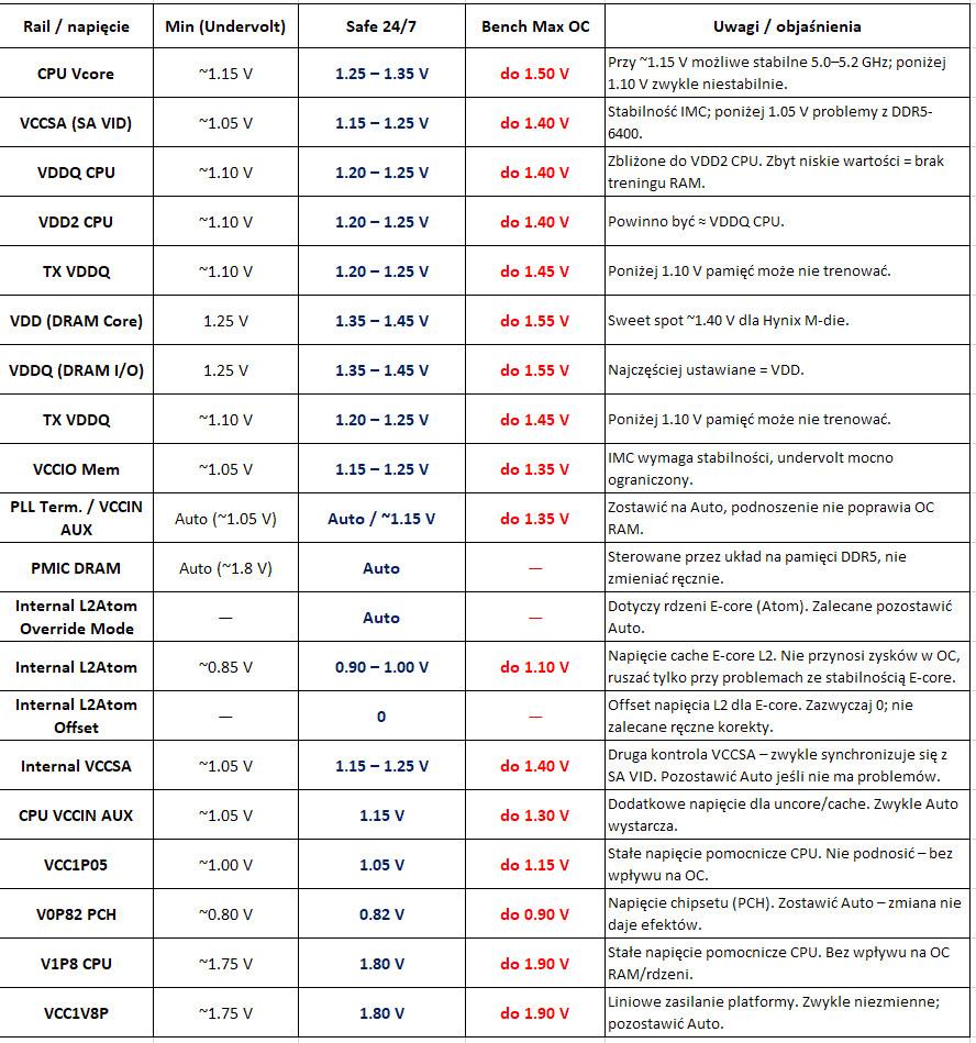 ITprospector 11 Opublikowano 24 Września Autor Opublikowano 24 Września (edytowane) @ITHardwareGPT Dobra sam jeszcze raz sprawdziłem i wstawiłem poprawki oraz wstawiam jako tekst do ewentualnej edycji. Czy poniższe jesteś w stanie sprawdzić lub przynajmniej potwierdzić, że jest OK Mam nadzieję, że image jest lepiej czytelny. Będę wdzięczny i z góry bardzo dziękuję. Rail / napięcieMin (Undervolt)Safe 24/7Bench Max OCUwagi / objaśnienia CPU Vcore~1.15 V1.25 – 1.35 Vdo 1.50 VKluczowe napięcie rdzeni P-core/E-core. Przy ~1.15 V możliwe stabilne 5.0–5.2 GHz. Poniżej 1.10 V niemal zawsze niestabilność. Do codziennego OC nie przekraczać 1.35 V. 1.50 V tylko krótkie benchy – ryzyko degradacji. Preferuj tryb Adaptive / Offset zamiast stałego Override (Fixed) dla długowieczności; ustaw też twardy sufit (IA VR Voltage Limit) VCCSA (SA VID)~1.05 V1.15 – 1.25 Vdo 1.40 VStabilność kontrolera pamięci (IMC). Poniżej 1.05 V problemy z DDR5-6400+. Zbyt wysokie (>1.35 V) mocno grzeje IMC, skraca jego żywotność. Przy DDR5-6400 typowo 1.15–1.22 V. Zbyt wysokie (>1.30–1.35 V) grzeje IMC VDDQ CPU~1.10 V1.20 – 1.25 Vdo 1.40 VNapięcie DDR5 PHY w CPU. Zbliżone do VDD2 CPU. Zbyt niskie = brak treningu RAM. Wyższe poprawia boot wysokich taktowań, ale pogarsza termikę. To kluczowe napięcie dla stabilności RAM. (w HVInfo raportowane jako TX VDDQ lub VDDQ TX VDD2 CPU~1.10 V1.20 – 1.25 Vdo 1.40 VBliźniacze z VDDQ CPU – powinny być równe. Rozjazdy mogą powodować BSOD lub brak POST. To zasilanie wspierające IMC nie jest bezpośrednio tak krytyczne jak VDDQ CPU. Najlepiej trzymać równe lub nieco wyższe od VDDQ CPU (+0.01–0.03 V) TX VDDQ~1.10 V1.20 – 1.25 Vdo 1.40Vw Gigabyte to jest to samo napięcie co VDDQ CPU. Napięcie wyjściowe linii danych DDR5. Poniżej 1.10 V pamięć często nie trenuje. Przy OC 6600–7200 MHz zwykle trzeba ≥1.25. W Gigabyte w HWInfo raportuje napięcie VDDQ CPU z bios, VDD (DRAM Core)1.25 V1.35 – 1.45 Vdo 1.55 VGłówne napięcie DRAM. Sweet spot dla Hynix M-die: ~1.40 V. Powyżej 1.50 V szybki wzrost temperatur modułów. Najczęściej ustawiane równe VDD. Oddzielna regulacja czasem poprawia stabilność przy wysokim OC (6800+). VDDQ (DRAM I/O)1.25 V1.35 – 1.45 Vdo 1.55 VNajczęściej ustawiane = VDD. Stabilność IMC. Undervolt ograniczony, zbyt nisko = brak bootu. Zbyt wysoko = grzeje uncore. VCCIO Mem~1.05 V1.15 – 1.25 Vdo 1.35 VIMC wymaga stabilności, undervolt mocno ograniczony. PLL Term. / VCCIN AUXAuto (~1.05 V)Auto / ~1.15 Vdo 1.35 VWpływ głównie przy ekstremalnym OC RAM. Do codziennego użytku zostawić Auto – podnoszenie nic nie daje. PMIC DRAMAuto (~1.8 V)Auto—Sterowane przez układ na module DDR5. Nie ruszać ręcznie – ryzyko uszkodzenia RAM. Internal L2Atom Override Mode—Auto—Dotyczy rdzeni E-core (Atom). Zalecane pozostawić Auto. Internal L2Atom~0.85 V0.90 – 1.00 Vdo 1.10 VNapięcie cache E-core L2. Nie przynosi zysków w OC, ruszać tylko przy problemach ze stabilnością E-core. Internal L2Atom Offsetdo ok. –30 mV0do ok. +50 mVOffset napięcia L2 dla E-core. Zazwyczaj 0; nie zalecane ręczne korekty. Internal VCCSA~1.05 V1.15 – 1.25 Vdo 1.40 VDruga kontrola VCCSA – zwykle synchronizuje się z SA VID. Pozostawić Auto jeśli nie ma problemów. CPU VCCIN AUX~1.05 V1.15 Vdo 1.30 VDodatkowe napięcie dla uncore/cache. Zwykle Auto wystarcza. Podnosi stabilność przy mocnym OC cache. VCC1P05~1.00 V1.05 Vdo 1.15 VStałe napięcie pomocnicze CPU. Nie podnosić – bez wpływu na OC. V0P82 PCH~0.80 V0.82 Vdo 0.90 VNapięcie chipsetu (PCH) zalecane Auto. Jest to napięcie zasilające logikę PCH (chipset — kontrolery SATA, NVMe/PCIE root-complex, USB, LAN itp.). PCH ma własny regulator; zmiana napięcia wpływa głównie na działanie kontrolerów I/O i stabilność magistrali. V1P8 CPU~1.75 V1.80 Vdo 1.90 VStałe napięcie pomocnicze CPU. Bez wpływu na OC RAM/rdzeni. VCC1V8P~1.75 V1.80 Vdo 1.90 VLiniowe zasilanie platformy. Zwykle niezmienne; pozostawić Auto. Edytowane 24 Września przez ITprospector 1