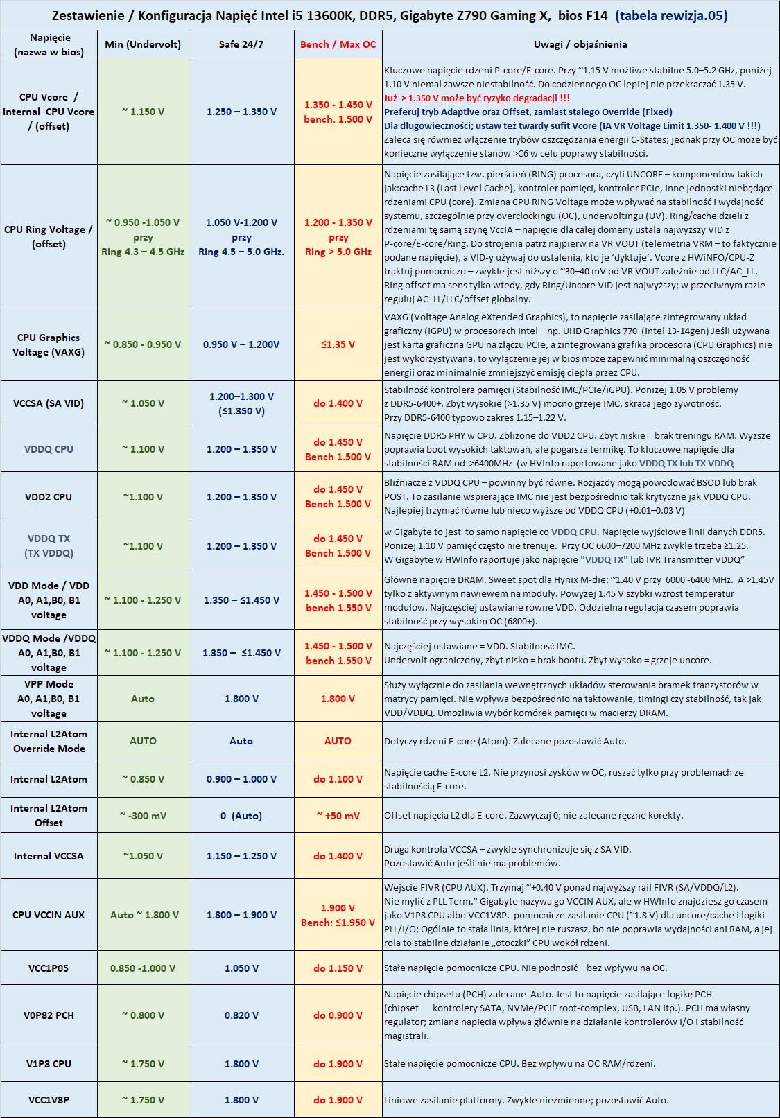 ITprospector 11 Opublikowano 23 Września Opublikowano 23 Września (edytowane) Zestawienie / Konfiguracja Napięć Intel i5 13600K, DDR5, Gigabyte Z790 Gaming X Materiał ma na celu przedstawienie możliwych wartości napięć dla tej lub podobnej platformy. Osoby zainteresowane zapraszam do merytorycznej dyskusji i dzielenie się doświadczeniem oraz wiedzą, jak i zgłaszanie ew. błędów. 2025.10.28 – Edycja pierwszego posta w celu zwiększenia przejrzystości i ułatwienia dostępu do zestawienia najnowszej wersji tabeli, która jest na bieżąco aktualizowana w miarę możliwości, a czytający nie musiał się przebijać przez ściany tekstu w dalszej części wątku. Wstawiam najnowszą wersję tabeli rev.05. Historia pierwszego posta została w całości zachowana poniżej. tutaj było przywołanie ITHardware GPT Popraw proszę i sprawdź w oparciu o najlepszą profesjonalną wiedzę oraz najlepsze doświadczenie praktyczne poniższe "zestawienie - konfiguracje napięć mojej platformy" Zrób to proszę bardzo dokładnie i szczegółowo w podobnym zestawieniu, ale tak bym mógł to sobie przekopiować. Umieść również dodatkowe zalecenia i wyjaśnienia od czego dane napięcie jest. Jeśli jakieś napięcia się powtarzają lub nie dotyczą mojego konfigu, to proszę wtedy usuń. Gigabyte Z790 Gaming X rev.1.0, bios F13 i5 13600K@5300/4000, Kingston Fury Renegate 2x16GB 6000@6400, Hynix, M-die Edytowane 28 Października przez ITprospector edycja pierwszego posta