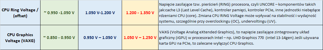 ITprospector 11 Opublikowano 9 Października Autor Opublikowano 9 Października (edytowane) @ITHardwareGPT Prośba o bardzo dokładne sprawdzenie napięć CPU Ring oraz CPU grafiki. Ewentualny komentarz. Dziękuję . Rail / NapięcieMin (Undervolt)Safe 24/7Bench / Max OCUwagi / objaśnienia CPU Ring Voltage / (offset)~ 0.950 -1.050 V1.050 V-1.200 V1.200 - 1.350 VNapięcie zasilające tzw. pierścień (RING) procesora, czyli UNCORE – komponentów takich jak:cache L3 (Last Level Cache), kontroler pamięci, kontroler PCIe, inne jednostki niebędące rdzeniami CPU (core). Zmiana CPU RING Voltage może wpływać na stabilność i wydajność systemu, szczególnie przy overclockingu (OC), undervoltingu (UV). CPU Graphics Voltage (VAXG)~ 0.850 - 0.950 V0.950 V – 1.050 V 1.050 V – 1.250 VVAXG (Voltage Analog eXtended Graphics), to napięcie zasilające zintegrowany układ graficzny (iGPU) w procesorach Intel – np. UHD Graphics 770 (intel 13-14gen) Jeśli używana karta GPU na PCIe, to zalecane wyłączyć CPU Graphics. Edytowane 9 Października przez ITprospector