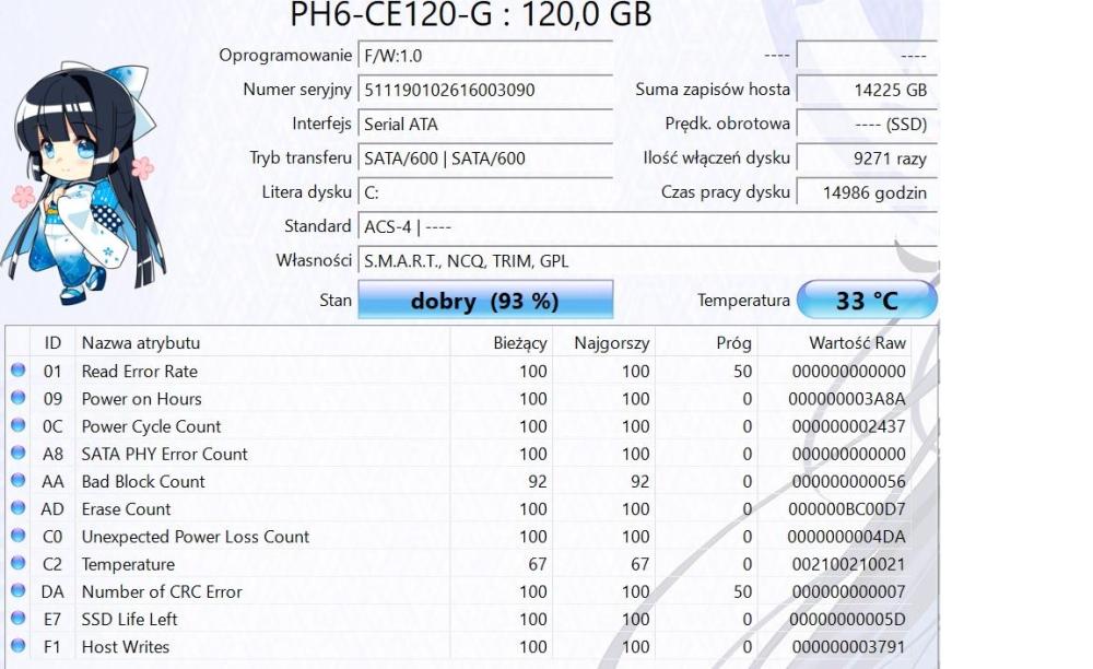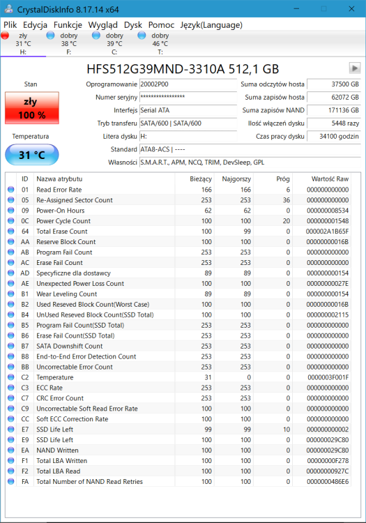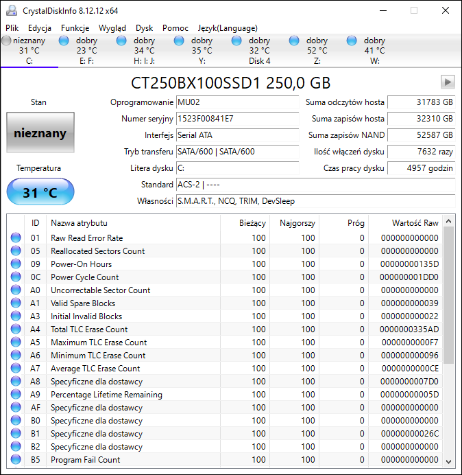 Keller 726 Opublikowano 4 Października Autor Opublikowano 4 Października (edytowane) 30 minut temu, nalewator napisał(a): Uruchomiłem ten Crucial Storage Executive i pokazuje smart ale chyba też nie do końca poprawnie ( np. czas pracy dysku dziwnie mały). Poza tym w innym dysku wyświetlił mi możliwość wgrania nowego firmware ( czy warto , czy bezpieczne?) Coś tu nie gra, 34 invalid blocks? Co do firmware, ja aktualizowałem do napędów DVD i dysków i nigdy nie było problemu. Znacznie gorzej z płytami głównymi jest aktualizując spod Windowsa. Zadbaj tylko by się nie zawiesił. Z drugiej jak masz ważne dane, to i tak lepiej backup zanim zaaktualizujesz. Czasem nawet dzięki aktualizacjom prędkość się zwiększa. -- Dobra, sprawdziłem, te bad blocks to nie jest problem. Co do czasu używania wychodzi tak: 4958 godzin podzielić na 3285 dni = 1,51 godziny dziennie. Może średnio tyle używasz. Tzn, raz może więcej godzin (6), a 3 dni np. 0? Edytowane 4 Października przez Keller