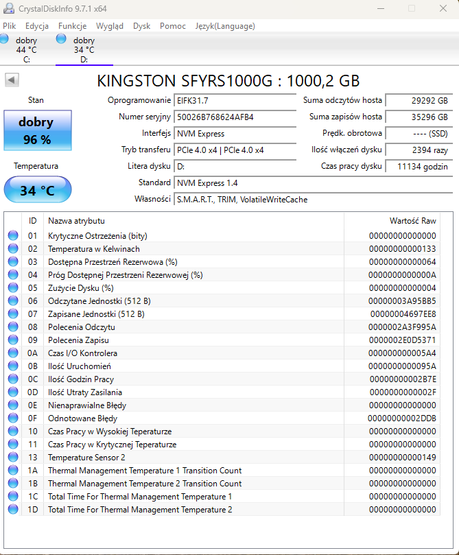 Tomek_Tomasz 0 Opublikowano 3 Października Opublikowano 3 Października (edytowane) U mnie 96% ma dysk Kingston Fury Renegade 1TB, który kupiłem w styczniu 2023. Czyli mam go ponad 2.5 roku. Używany był jako dysk systemowy a komputer raczej często używany. Niedawno zrobiłem z niego dysk na dane. Nie wiem czy to duże zużycie czy nie, ale daję do porównania. Zapisane 35TB. Edytowane 3 Października przez Tomek_Tomasz