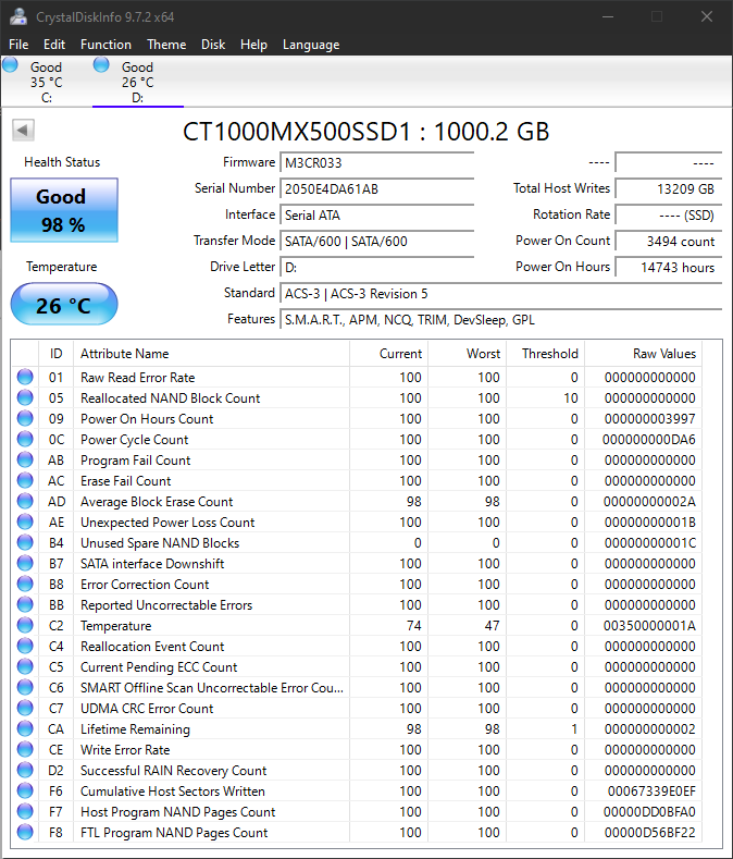 tuhmunud 207 Opublikowano 3 Października Opublikowano 3 Października Crucial MX500, ~13 TB zapisu, 4 i pół roku, magazyn (system przez pół roku): Kingston KC2500, ~114 TB zapisu, 4 lata, system: