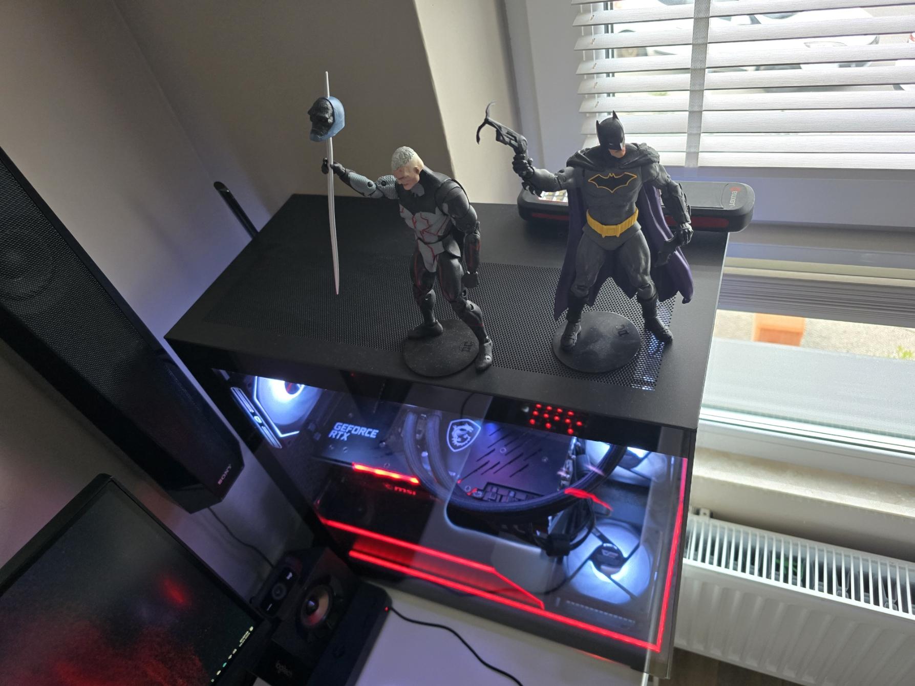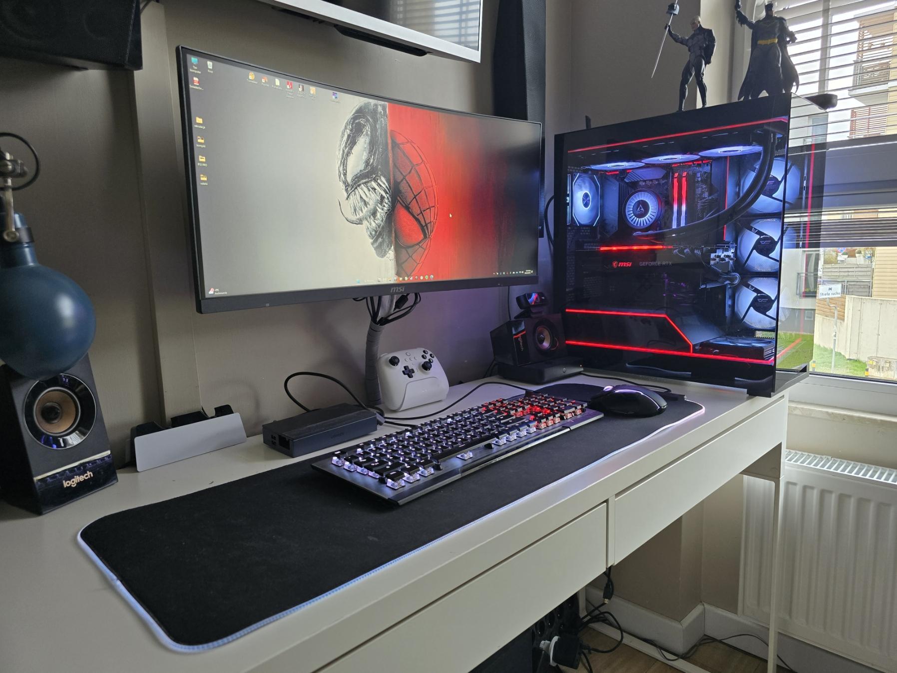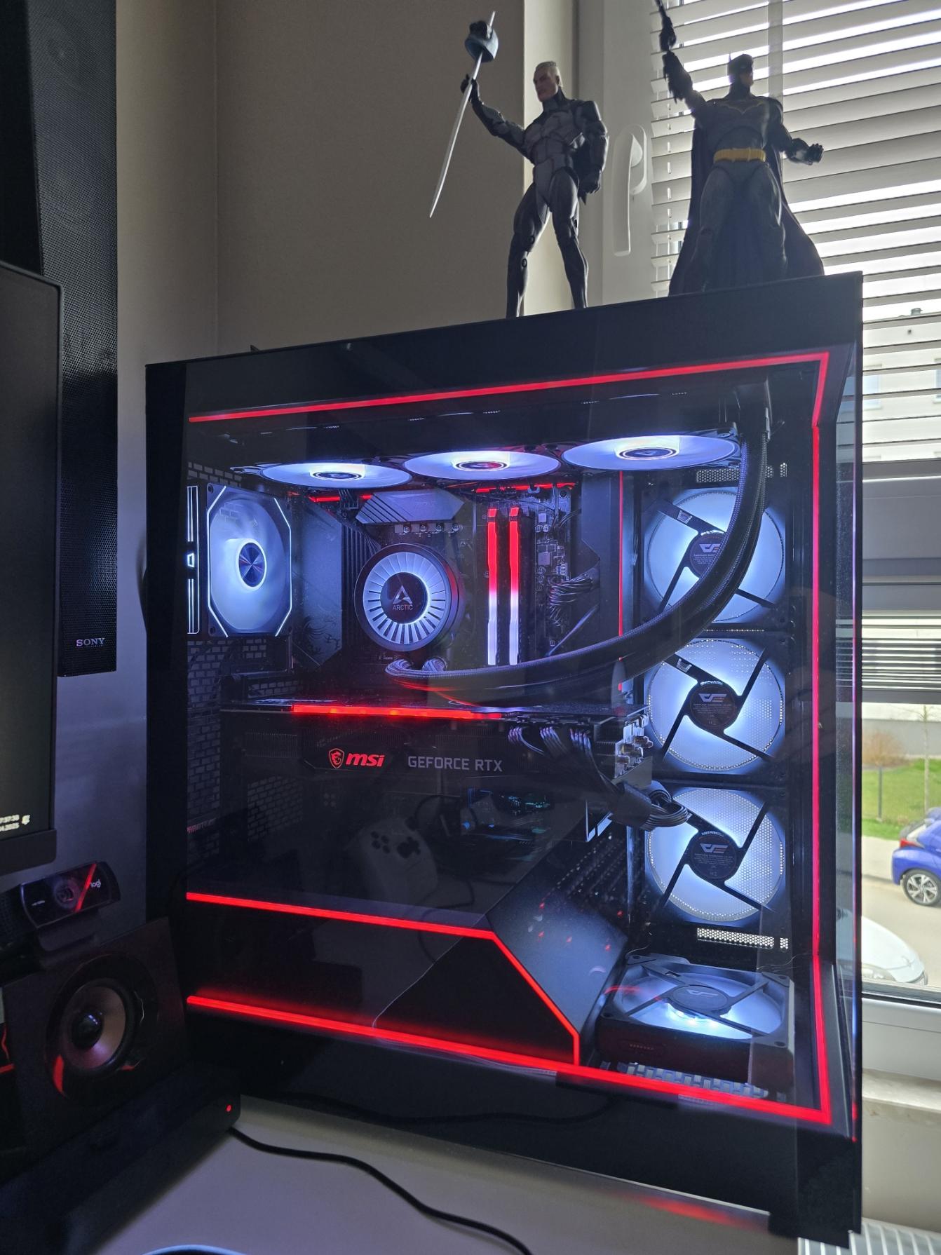 Qrdello 826 Opublikowano 6 Kwietnia Opublikowano 6 Kwietnia Zmiany dwie u mnie: 1) Odyssey poszedł do drugiego kompa, a mi się w dobrej cenie udało kupić MSI Optix 30 cali 21:9. Wprawdzie tylko 1080p, ale na pierwszy ultra-wide nie ma co szaleć. Nie wiem czy będę chciał zostać przy tym typie ekranów... Tak czy inaczej, 200hz, dodatkowe porty usb, wideo po usb-c, sporo ustawień pod appką w windowsie, synchronizacja oświetlenia z płytą. Fajny monitorek ogólnie, za 8 stówek jak znalazł. 2) MSI Gaming X Trio 3080ti zamiast asusa TUF. Co ciekawe, kilka fpsów więcej na tej karcie mam, jest też - co zaskakujące - cichsza i chłodniejsza od TUFa. No i nie muszę armoury crate do świecidełek instalować. A tu focie: 7