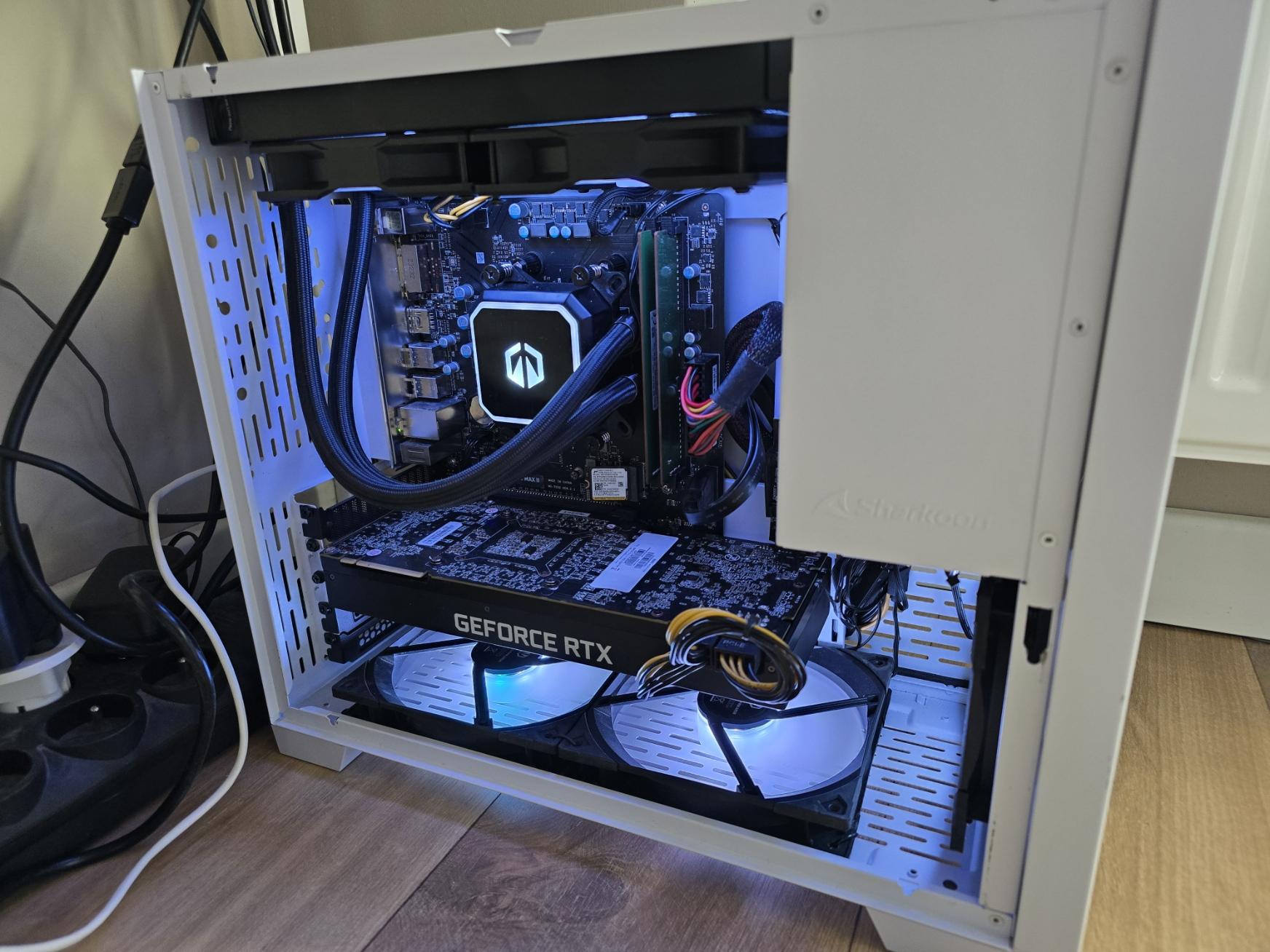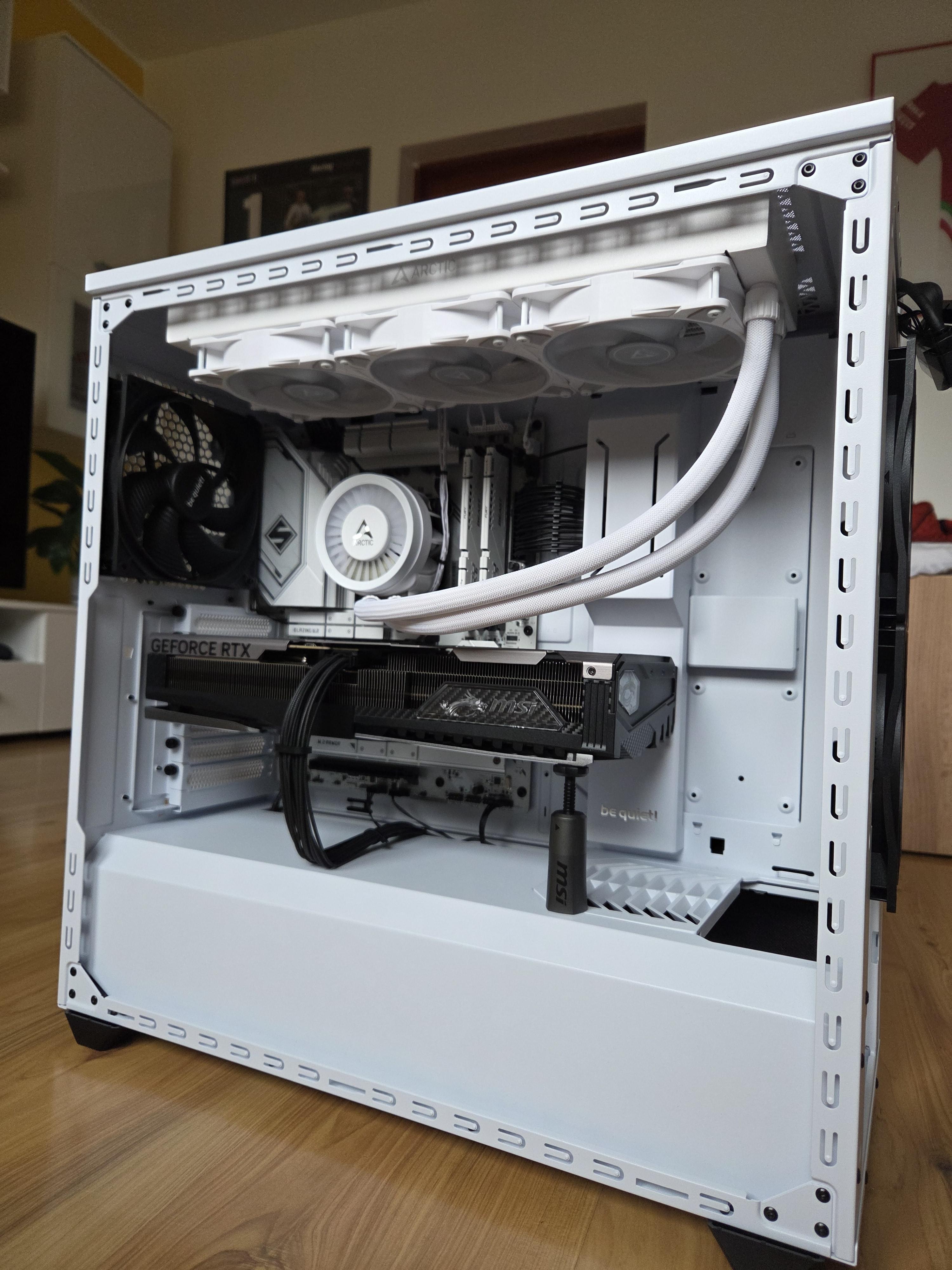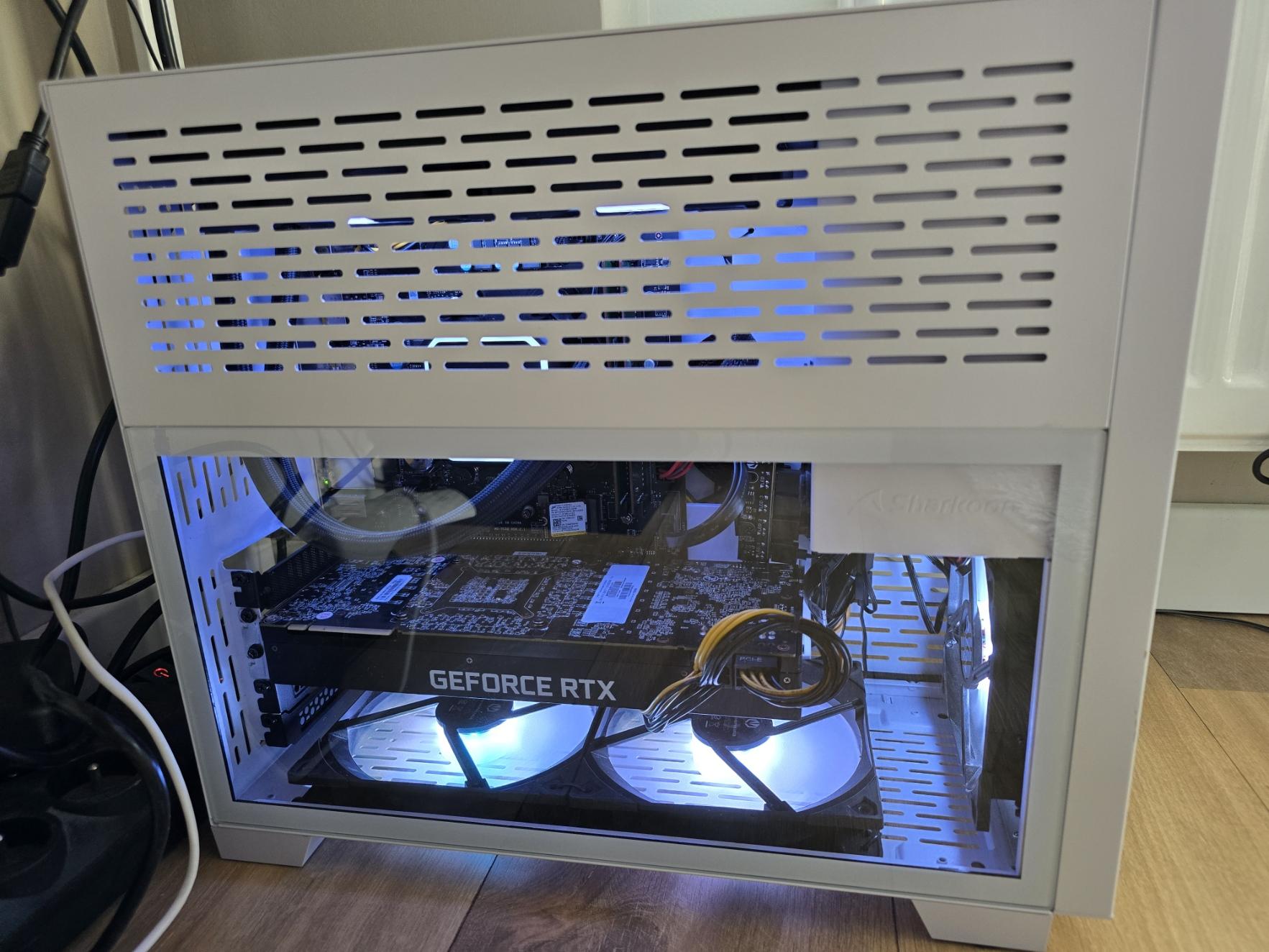 Qrdello 826 Opublikowano 13 Kwietnia Opublikowano 13 Kwietnia Nic specjalnego, odgrzebalem sharkoona, przerzucilem do niego ryza 2700. Mala zgrabna, aczkolwiek pod katem ukladania kabli niewdzieczna obudowa. Natomiast co tutaj ciekawe, to PNY 2080Ti blower, którego dostalem na testy i moze przytulenie od znajomego. Karta po serwisie, fabrycznie bez backplate - i ktos podczas demontazu urwal kilka konsensatorów oraz przerysowal scieżki. Obecnie karta po naprawie, dziala poprawnie pod katem wydajności - teoretycznie nic jej nie jest. Ogólnie jest w stanie średnim, porysowany shroud, widać ząb czasu na śledziu (utlenia się miejscami), ponadto karta przez wzgląd na chlodzenie - pracuje dość glosno, nawet przy 50% obrotów, i jest wyjątkowo ciepla. Rdzeń potrafi dobić do 78C, core 93C. Pastę wymienilem, ale na NC-H1 - nie wiem czy karta zostanie u mnie, szkoda mi PTMa na nią póki co. Niemniej, nawet będąc w takiej kondycji karta pokazuje pazur. Nawet AC Shadows na high preset potrafi spokojnie trzymać 60 klatek w 1080p. W sumie z żadną testowaną przeze mnie grą nie ma z nią problemu. Za takiego blowera trzeba dać okolo 1100-1200zl, zależnie od stanu i miejsca pochodzenia. Kilka fotek (przemilczamy odwróconego NAVISa - tak jest wygodniej z wężami, oraz dysk m.2 - akurat taki krótki mialem :p ) 2