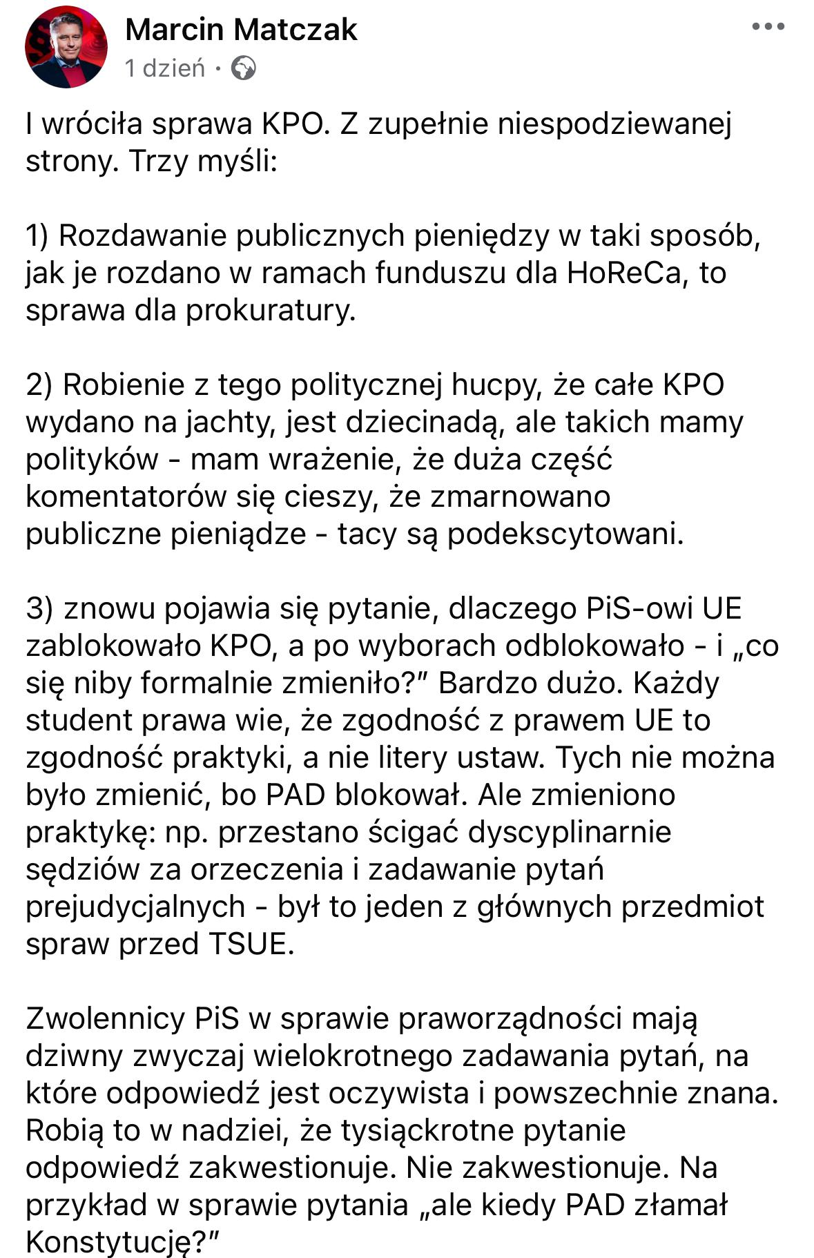 Afera KPO będzie się ciągnęła za KO/Tuskiem dłużej niż Amber Gold. Ludzie dalej nie potrafią zrozumieć skąd bierze się kasa (60% kwoty to pożyczka bezzwrotna) i myślą że my płacimy za KPO, z podatków z PL - chociaż to prędzej Hans i Jarre za to zapłacił ze swoich podatków, bo Polska nadal jest beneficjentem. Poziom afery jak zwykle jest wyolbrzymiony, głównie przez HoReCa które jeśli dobrze pamiętam było konikiem Morawieckiego za COVIDu. Oczywiście jak to bywa z przejęciami władzy, nie sprawdza się poprzedników bo administracja i tak tego nie ogarnia, poleciało wszystko do podpisu bez weryfikacji, a wnioski były składane jeszcze za czasów PiS - bo to PiS ustalił KPO - format, ilość środków itd.