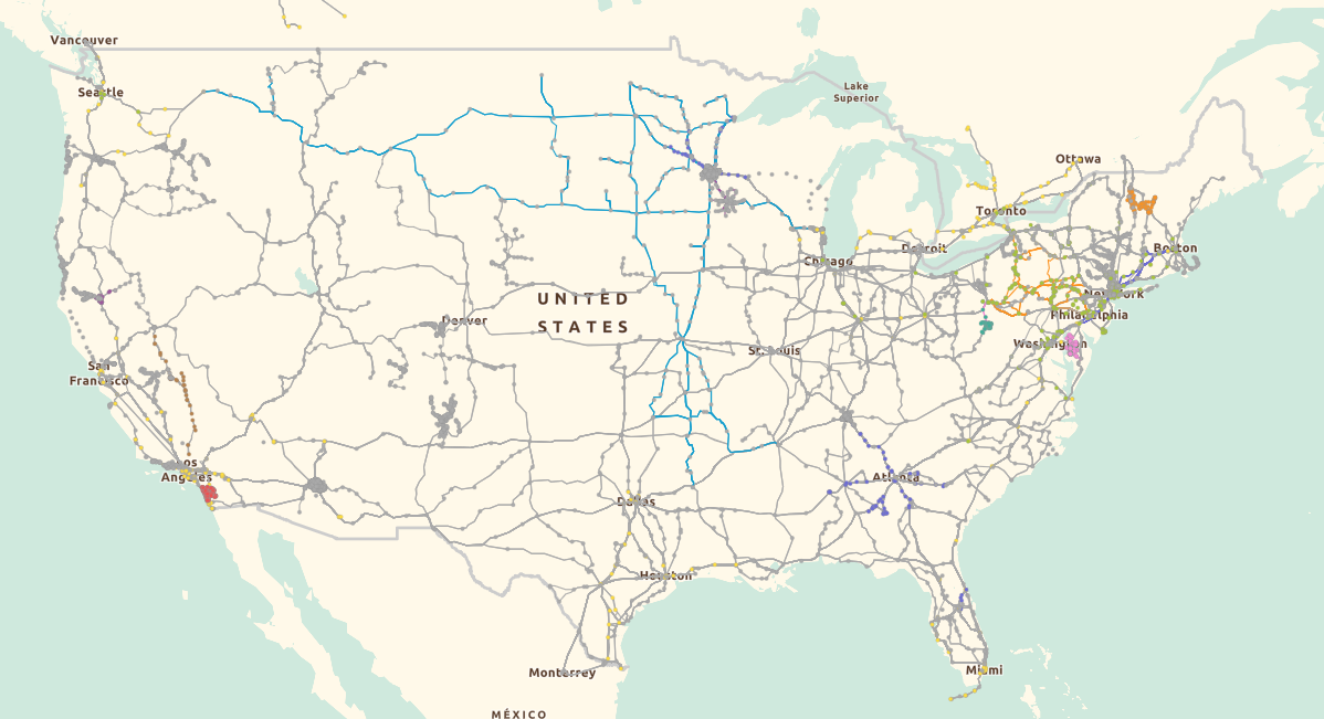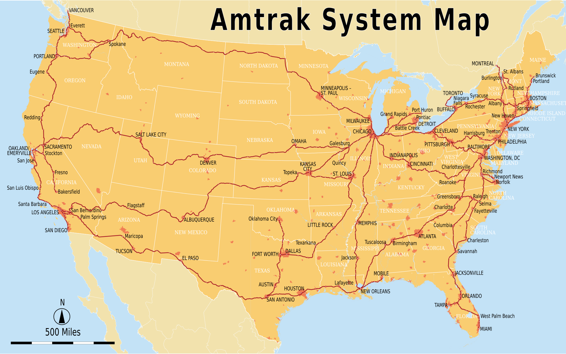 Tu masz np. sieć kolei Amtrak przewoźnika finansowanego z kasy publicznej, coś jak nasze PKP (to nie jedyny przewoźnik pasażerski i niepełna mapa kolejowa)