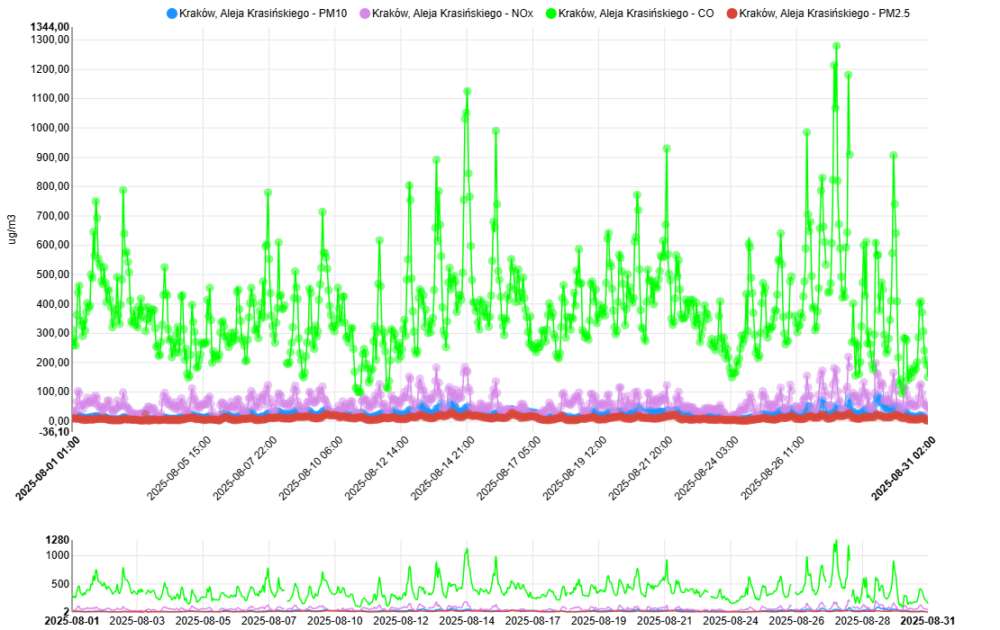 Kraków w sierpniu tego roku, źródło GIOŚ, dane do wyszukania tutaj https://powietrze.gios.gov.pl/pjp/archive/station_details/400#