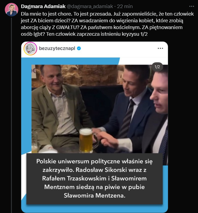Nadrobiłem właśnie dzisiejszy wywiad Trzaskowskiego u Mentzena, a tu w trakcie oglądania zaczęły spływać zaskakujące informacje, że Trzaskowski po wywiadzie przybył do pubu Mentzena i zaczęli pić piwo w ramach "after party", do tego jeszcze dołączył Sikorski, a Mentzen to wręcz dosiadł do stolika, przy którym siedzieli Sikorski z Trzaskowskim. Jak na to luknąłem, to pierwsze co pomyślałem, że to się nie dzieje naprawdę xD. Teraz widzę, że o to piwo najbardziej się spruwają elektorat Konfy oraz PiS-u wraz z politykami tychże partii, a Bosak z Wiplerem mają już nietęgie miny na to, co się wydarzyło :E.