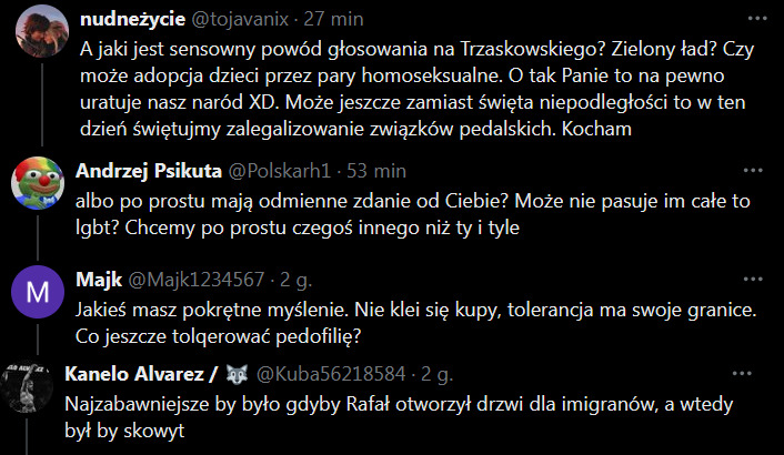 1. Wszędzie geje. Jeszcze kłamanie że Trzaskowski popiera adopcję przez homo co nie jest prawdą (nie jest skrajnie lewo). Zrównywanie homoseksualistów z pedofilami, co w ogóle jest idiotyzmem, bo jedni stosują przemoc, a drudzy mają dobrowolną relację i nikogo nie krzywdzą.