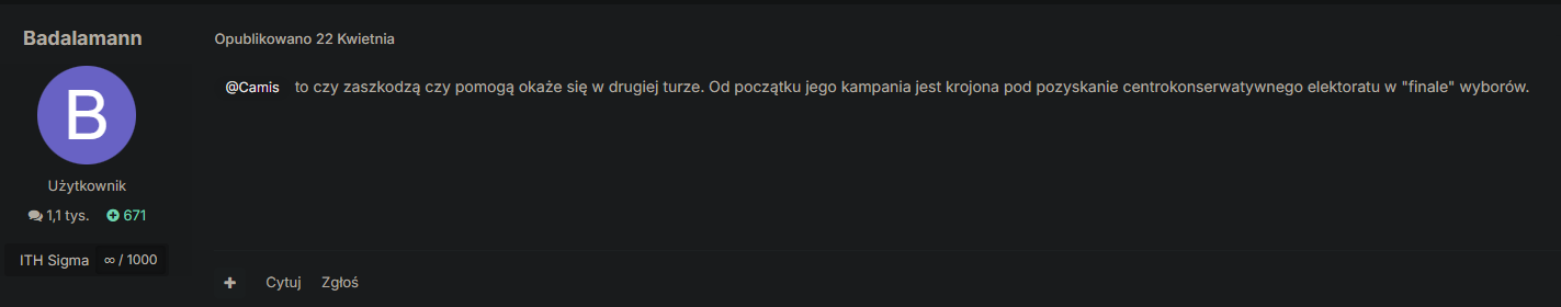 Z tym się zgodzę. Ogólnie zmiana poglądów o niemal 180° odstrasza wyborców. Czy to Bosak z Mentzenem, czy Tusk, czy Trzaskowski - ludzie są głupi, ale gdy się zorientują raz, że ktoś im wciska ściemę i kłamie mówiąc raz to, a raz coś przeciwnego, to mają tendencje się wkurzać.