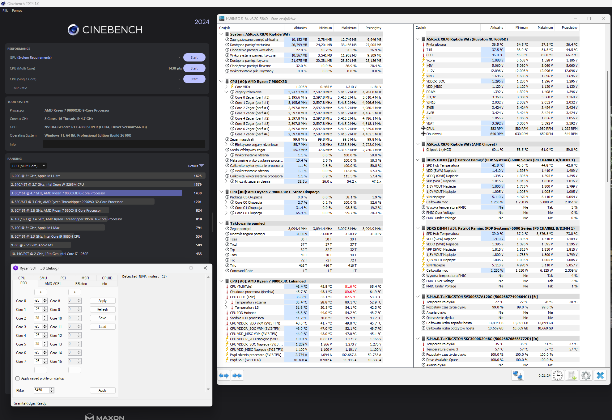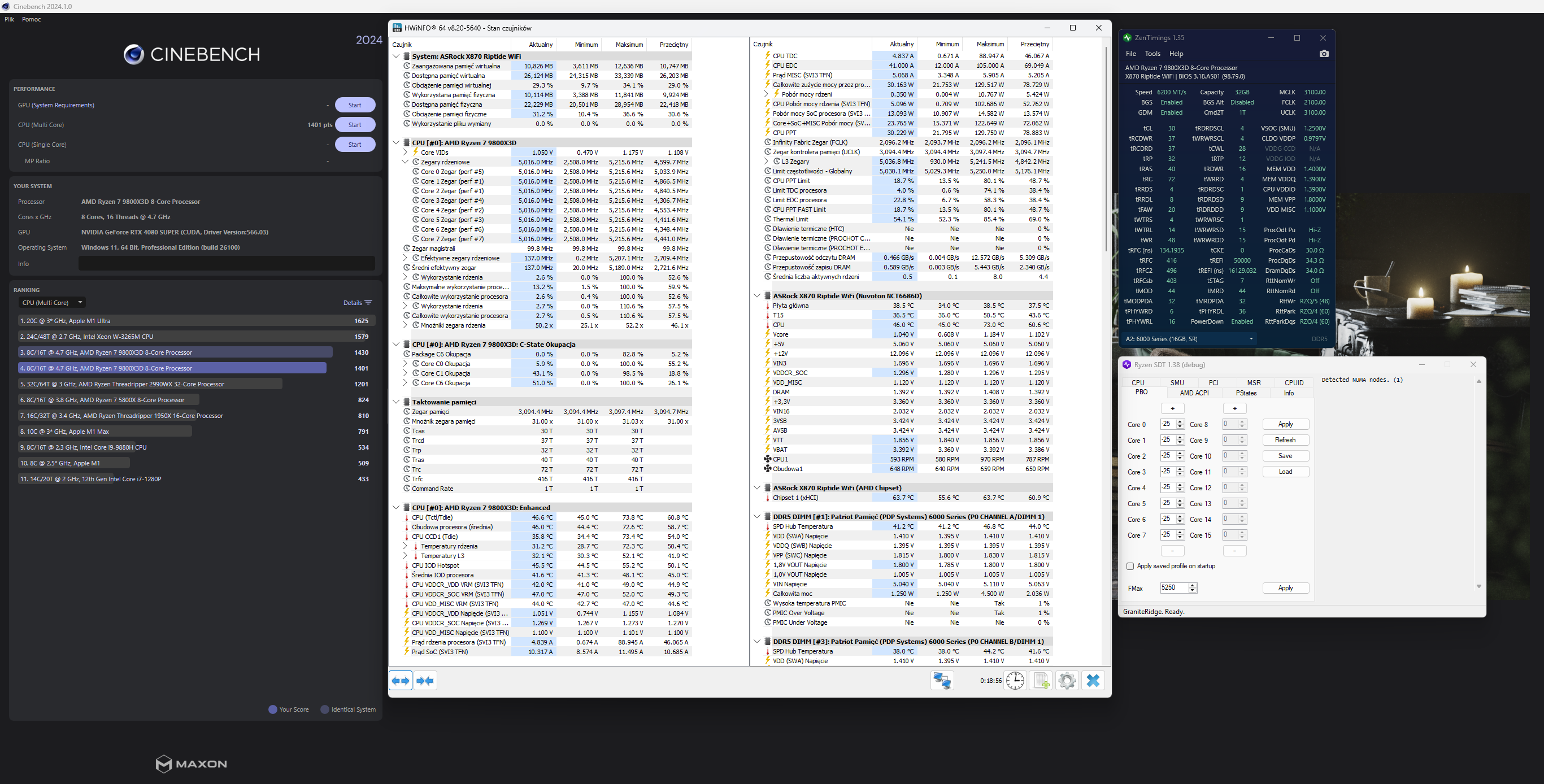 Poniżej PBO OFF, CO -25 i thermal throttling na 85 ustawiony. Limit mocy w AUTO, bo zapomniałem ustawić na płytę. Nie wiem czy dalsza rzeźba przyniesie jakieś korzyści w grach, bo aż tak to się nie znam na OC choć coraz bardziej mi się podoba. Kiedyś się bawiłem w kręcenie intela, ale tam nawet przy uszkodzeniu bym nie płakał, a tutaj gorzej. Delid w intelu też mi poszedł gładko i czasem nawet mam myśli czy nie zrobić tego dla sportu w 9800x3d, ale widziałem, że to nie jest już tak proste jak w niebieskich. No i sprzedałem imadło do ściągania czapek.