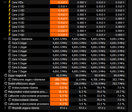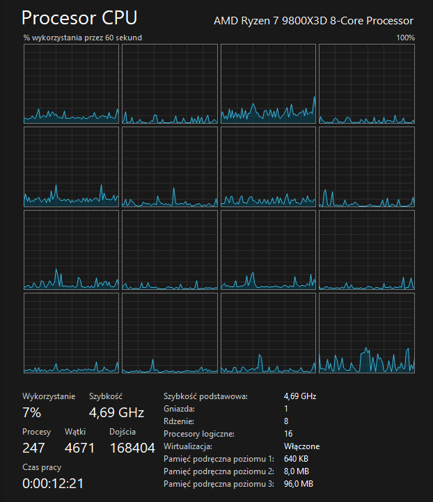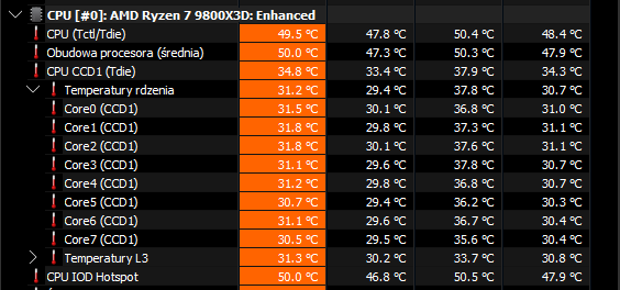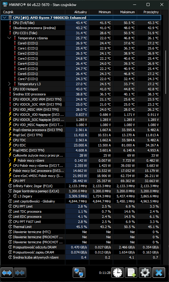 Ustawiasz tak samo, ale 9800 nie specjalnie się skaluje z zegarem, poza oczywiście niektórymi przypadkami, jak załadowanie shaderów i siatki dużej mapy. Natomiast zyski z ustawienia są inne, szczególnie 7800. Tego faktycznie można nie ruszać. 14600k czy 9700 też można - specjalnie wolałbym tego nie rozciągać - jest to trochę marnotrastwo. W moim przypadku jest miodzio przy 120, w innym może być i 100. 88 jest bezpieczne - absolutnie nie optymalne. Poza tym wystarczy otymizer dać na 30 i już masz po optymalnych ustawieniach AMD. Jak puścisz wszystko z płyty, to zobaczysz i 1.45v, co jest bezpieczne dla stabilności i znowu niekoniecznie optymalne. Tylko zegar zależy od napięcia i temperatury, temperatura od napięcia i optymalne sztywne ustawienie dla jednej sztuki będzie 1.25 dla drugiej 1.35. Co znowu ni jak się ma do AMD które stworzyło i ustawiło - ręczne ustawienia o ile są sensowne zawsze będą lepsze od fabrycznych, bo one muszą uwzględniać najgorsze kawałki krzemu i margines bezpieczeństwa, żeby zawsze było stabilnie… i nie wiedzą jakie włożysz chłodzenie. 88 W też pewnie ok, ale skoro domyślnie te procesory mają 65w, to 88 jest po to, żeby zrobić jakąś różnicę (w skrócie - wiadomo pbo itp). 120 vs 88 nie będzie w żaden sposób porównywalne do różnicy jaką masz 65 vs 88, ale będzie jeszcze sensowna i dla mnie widoczna przy dropach fps - dla wielu osób nie zrobi różnicy, tak jak dla mnie średni 250 - na monitorze 240hz nie widzę specjalnie różnicy czy to jest 180 czy 240, ale drop z 250 na 120 już tak. Moje ustawienia są o tyle fajne, że to właśnie minimalizują… i nie działa to tak samo na 88W. Na zdjęciu sprzed chwili masz 166w przy średnim 158 - maksymalnie widziałem 169, najczęściej jest to 164-168 w przy średnim 155-160. To jest bez sensu i właśnie coś mi się wydaje, że ustawianie ręczne limitów nic tu nie daje
