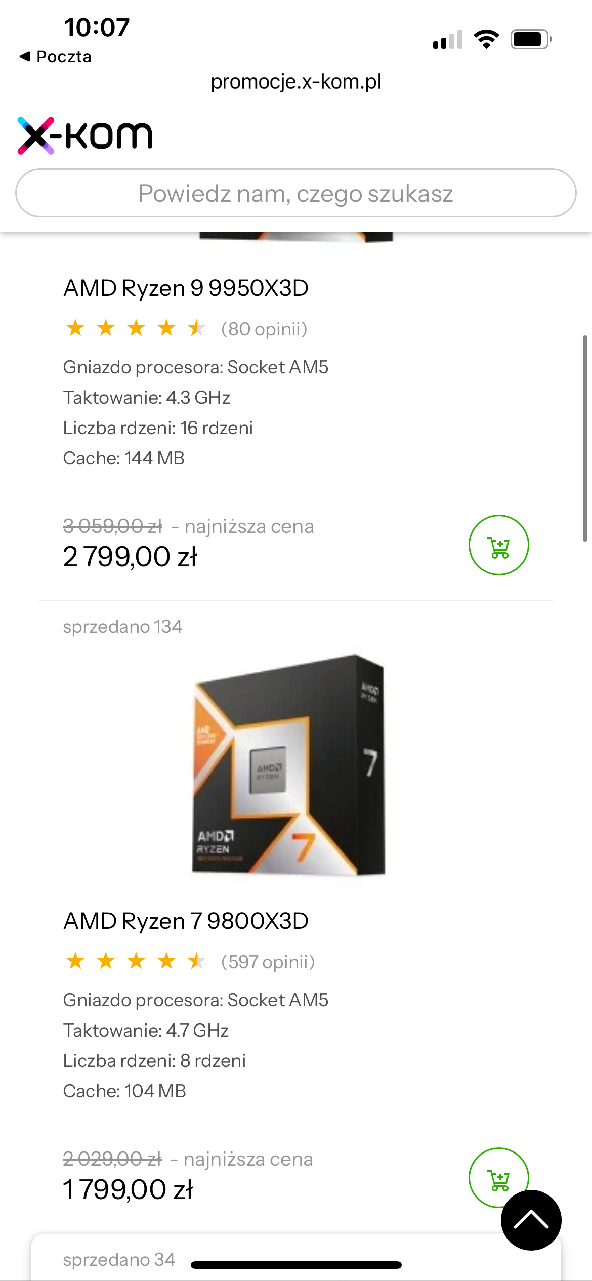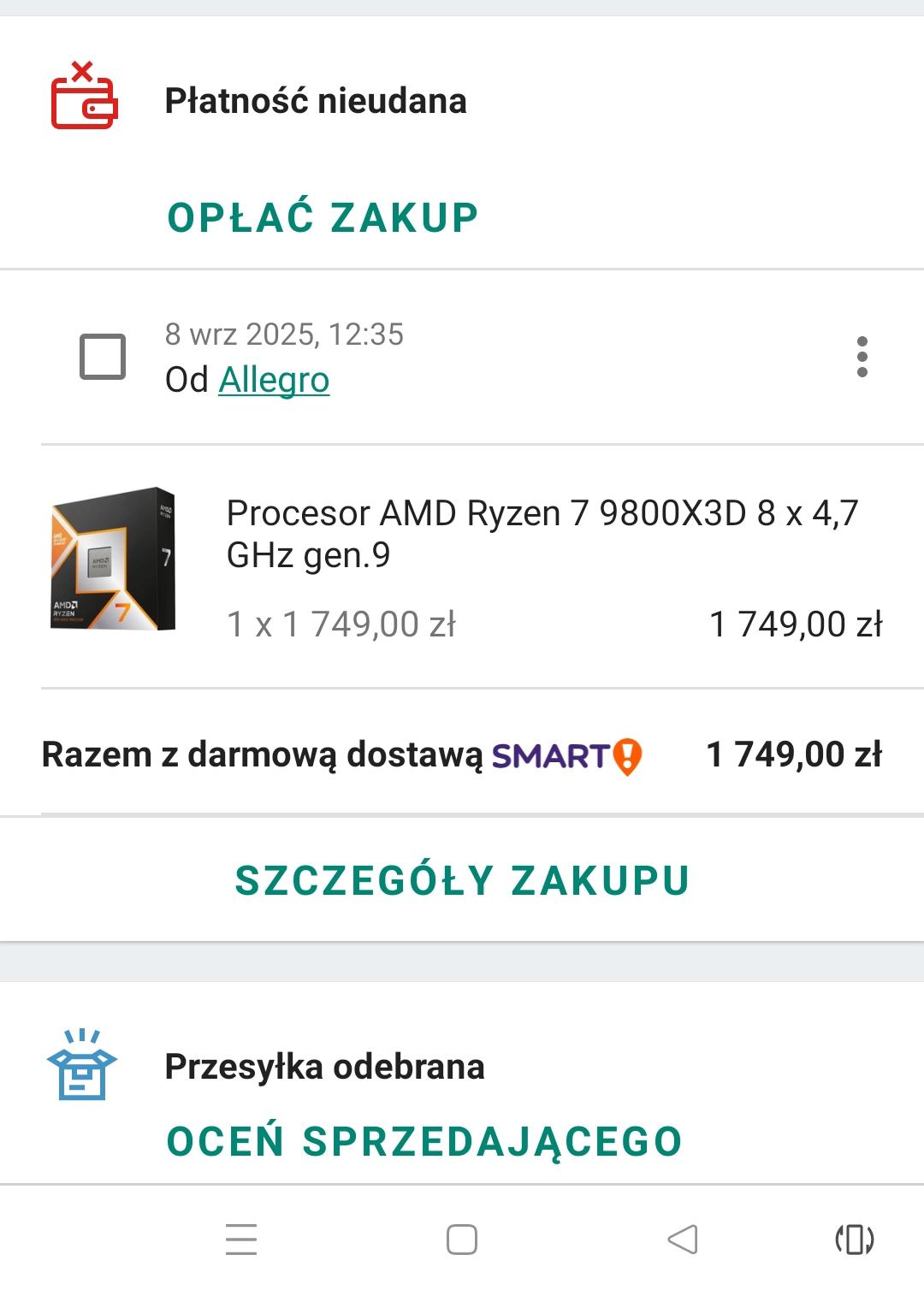 Wczoraj gadałem z @marcin2468 chłop mi napisał, że 9800X3D jest na allegro za 1750 zł. Wszedłem spojrzeć i nie było, ale miałem w obserwowanych ofertę z tą ofertą z poprzedniej wstawki z pepper sprzed kilku dni. Wszedłem w ofertę i wsadziłem fona do kieszeni bo musiałem zwolnić kibel. Teraz kupiłem tableta i chciałem sprawdzić na kiedy będzie bo w chwili zakupu widniało że na jutro. Wchodzę w moje zakupy a tam takie coś.