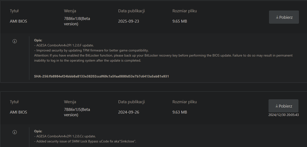 Przepraszam bardzo, moja ex b450 gdyby nie TPM to by nic nie dostała :E Rok czasu, jak widać pokazane jest kiedy ściągałem poprzedni bios i instalowałem. Płyty już nie mam, bo jest u nowego właściciela.