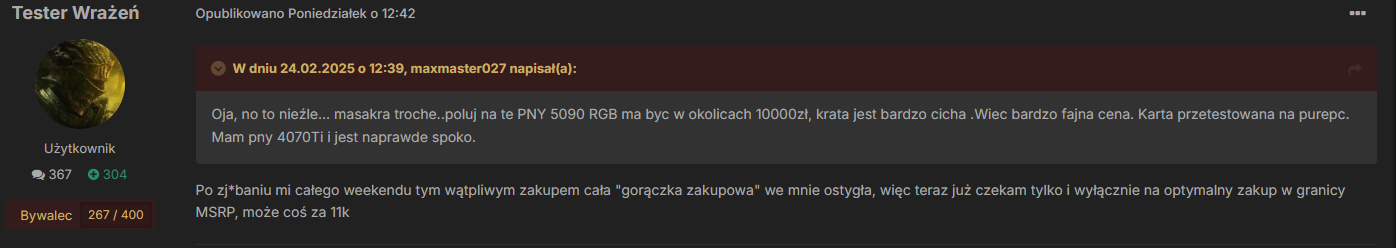 Dzisiaj na niemieckim NBB TUFy 5090 za 3.5k euro wisiały z 1.5h :E Gdzie jeszcze kilka dni temu w tej cenie zeszły by w kilka sekund. Liczba napaleńców którzy zapłacą każdą cenę z każdym dniem się kurczy.