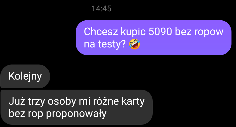Naprawdę chcesz jeszcze zasugerować, że ktoś Cię próbował oszukać? Naprawdę myślisz, że komukolwiek z branży byłby potrzeby zły PR, który bardzo łatwo zorganizować, dla Twojego kulawego RTX 5090? Bez komentarza...