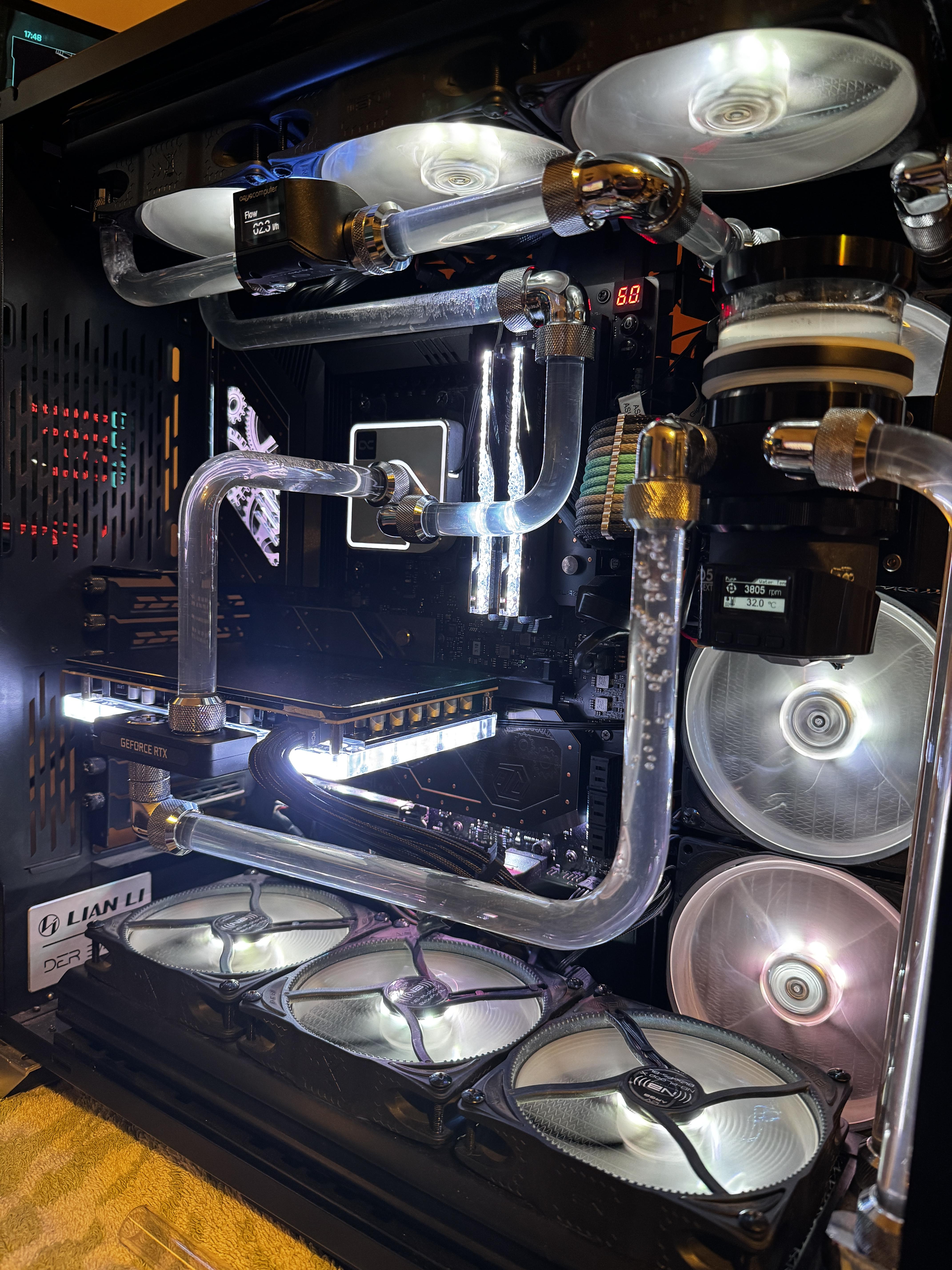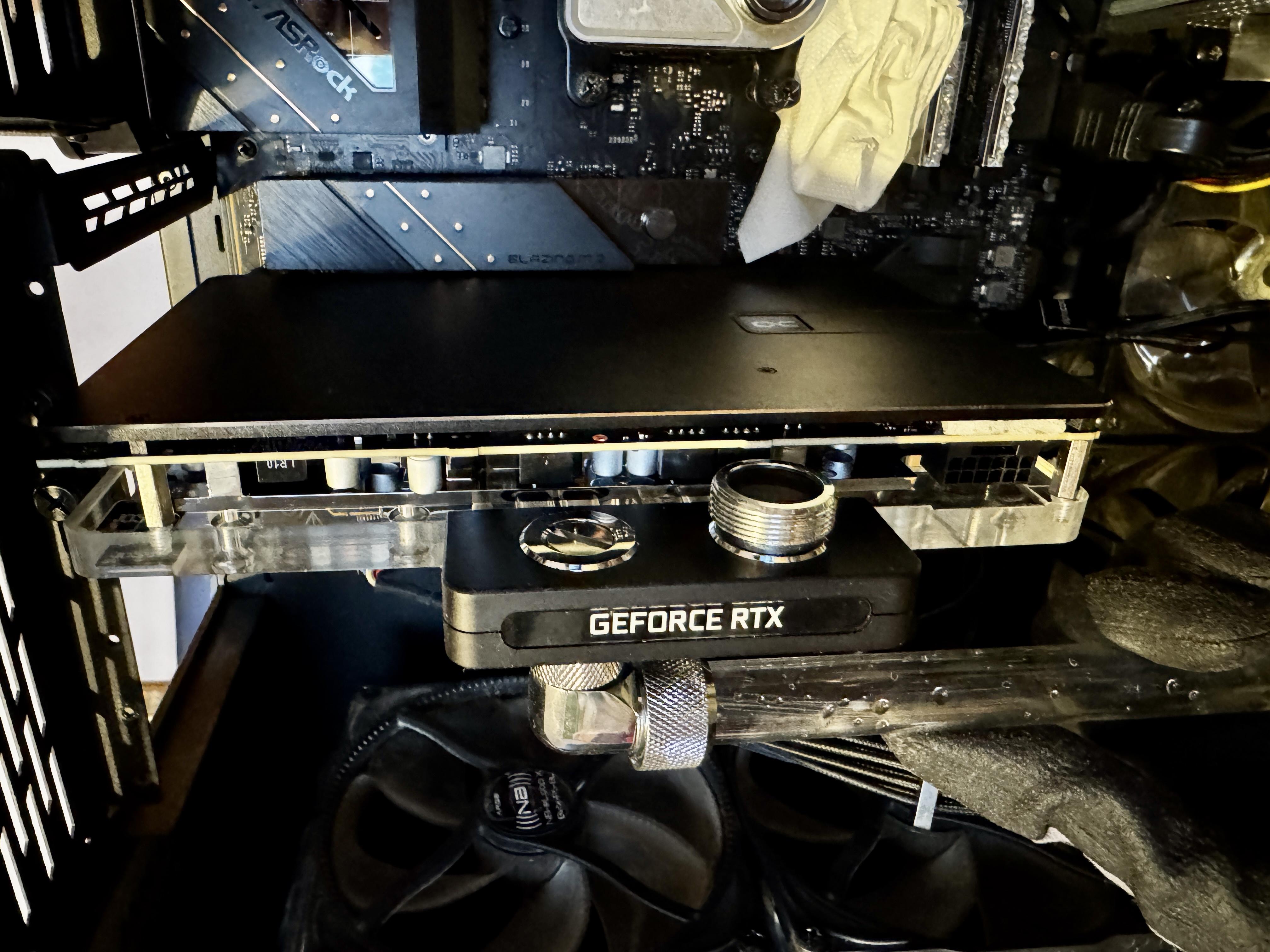 Ładuj tu lepsze chłodnice, ja przy układzie z chłodnicami 480x60 i 280x60, chłodzone proc, chipset i GPU 350W mam 40C na karcie i 30-31 woda (glikol). Wentylatory 120mm na 1000rpm i 140 na 700rpm. Możesz tu jeszcze sporo urwać. Ktoś dawał tu dane z Gigabyte 5080 waterforce WB w podobnym układzie i właśnie te 40 z hakiem było na karcie :metal: dzięki dobrej termice boost będzie trzymała jak głupia.