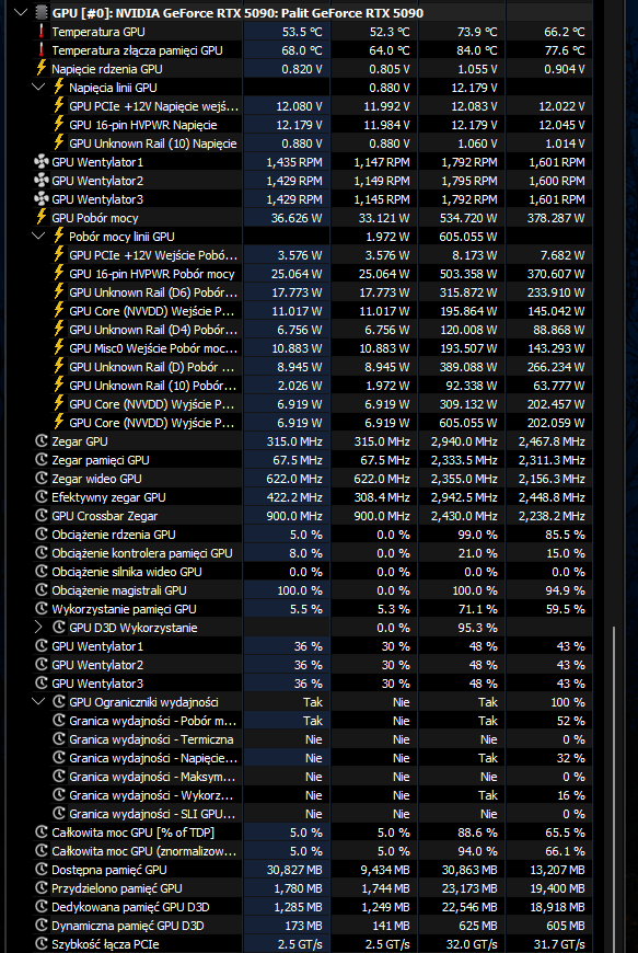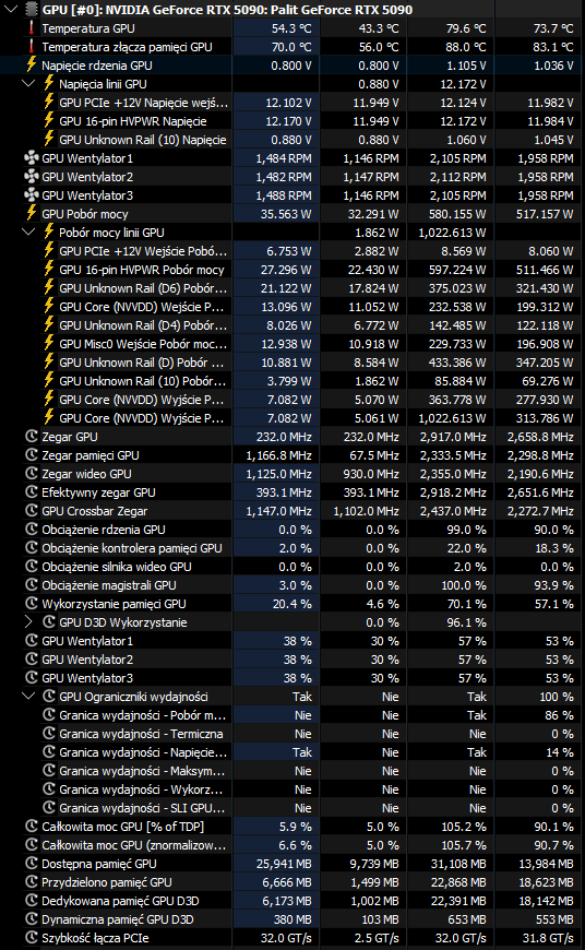 W oczekiwaniu na Ventusa postanowiłem poćwiczyć na Palicie UV , a że przy wcześniejszych kartach nie miałem nigdy potrzeby  bawić się w UV to jest to moje pierwsze podejście do tematu i po spędzeniu połowy dnia na zabawie z krzywą udało mi się zbić pobór mocy o około 100W bez straty wydajności a nawet z lekkim wzrostem. Screeny z HWinfo tego nie oddają ale przed UV w SW Outlaws w 4k karta leci cały czas limicie mocy, po UV skacze pomiędzy 440 a 500W przy zachowaniu tych samych zegarów. Ciężko mi powiedzieć czy jest to już stabilne ustawienie ale po paru poprawkach udało mi się pograć godzinę bez crashu. Przy takich temperaturach mógłbym już zaakceptować Palita gdyby nie cena.