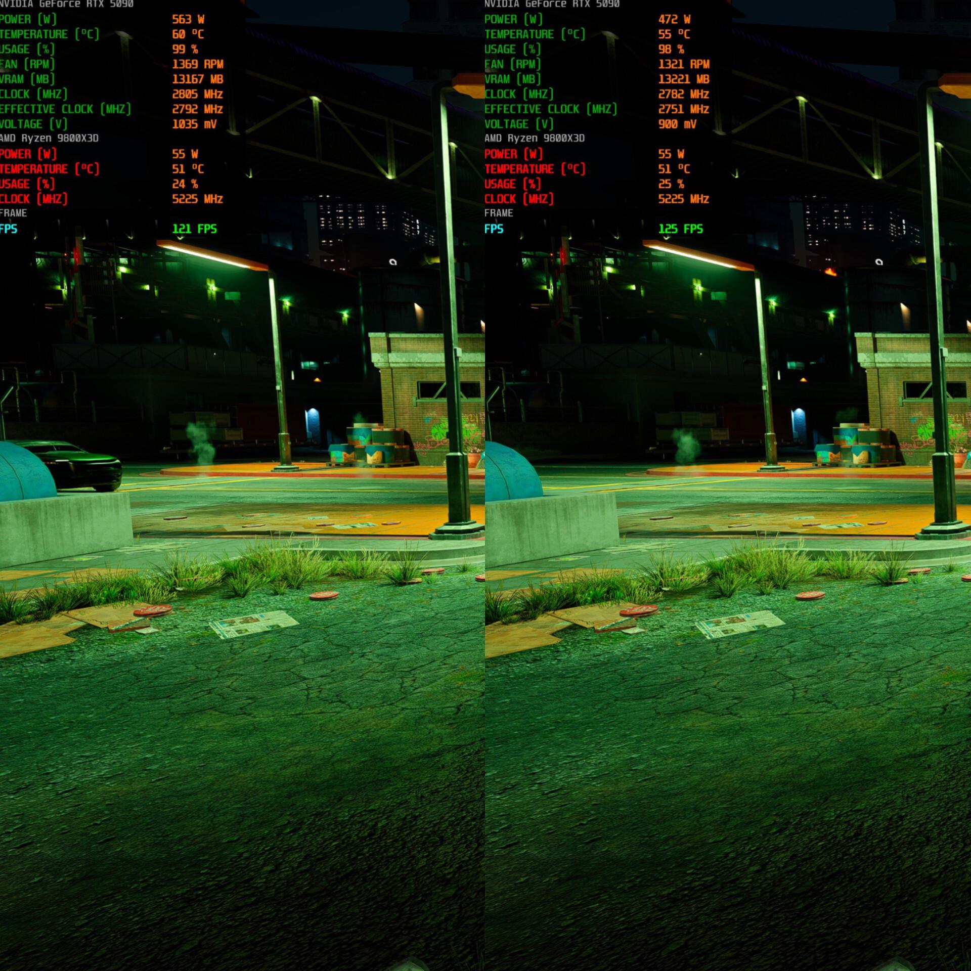 Mam jeszcze profil na 0.92V, z zegarkiem troszkę większym od stock. 2805Mhz-2840Mhz, zależnie od gry. Myślałem, że moja karta ogarnia 2.8GHz na 0.895V, ale zrewidowałem swoje oczekiwania po odpaleniu bencha Cyberka z PT. Co ciekawe, bez FG, karta była stabilna, ale po odpaleniu FG przy DLSS Q Transformer, musiałem ją trochę dokarmić :D. Taki Q II RT z palcem latał na tym napięciu a Cyberek z FG już nie.