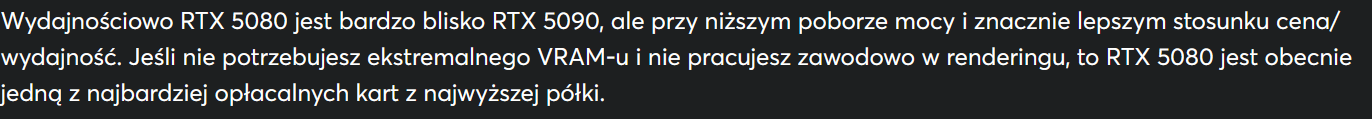 No chyba, że ktoś tak naprawdę potrzebuje wydajności 5090tki i już 5080 jest kompromisem, a tych +20% może boleśnie zabraknąć (np. w UEVR)