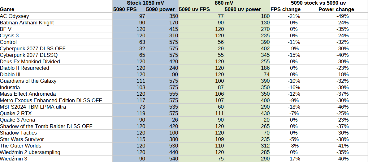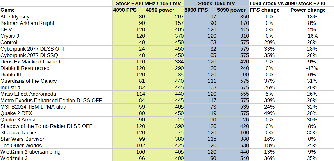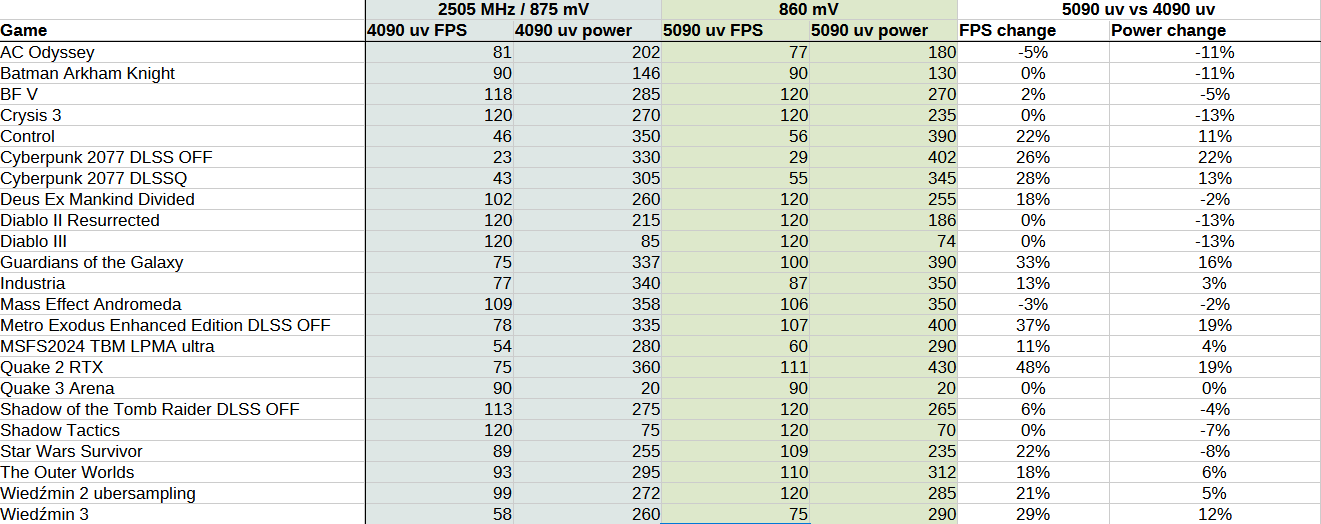 Ogólnie na stock ustawieniach wzrost FPS jest z grubsza proporcjonalny do wzrostu poboru mocy. Czasem lepiej czasem gorzej, im więcej RTX tym lepiej (przeważnie). Szkoda że nie wszędzie są takie wzrosty jak w Q2RTX. Po mocnym UV 5090 ma około 10% lepszy perf/W niż 4090 po mocnym UV.