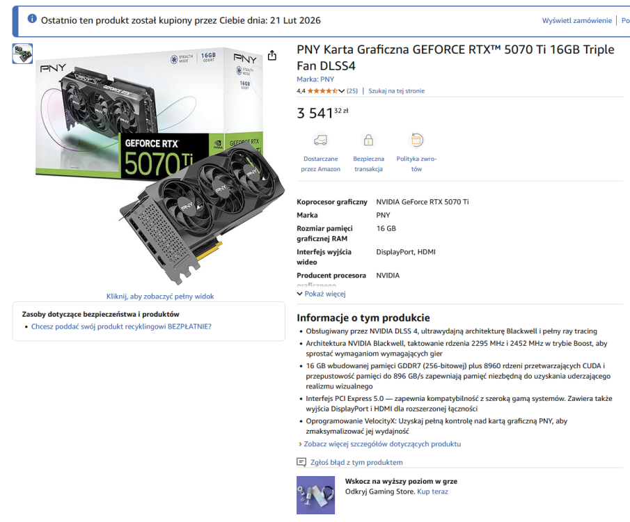 • Za 5299zł masz Gigabyte Windforce RTX 5080 + Resident Evil Requiem. Opędzlujesz gierkę to jeszcze będziesz 150-200zł do przodka. (https://www.krsystem.pl/gigabyte_geforce_rtx_5080_windforce_oc_sff_16g__uszkodzone_opa-item-78256.html)