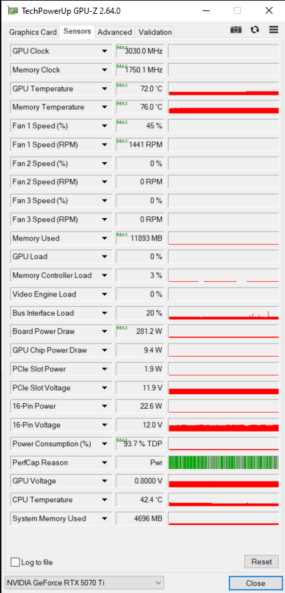 Normalnie- widzisz przecież aktualne napięcie 0,8V i przebieg w czasie, że karta od dłuższego czasu nic nie robi a tylko zaznaczone masz jakie były maxy podczas działania gpu-z (czyli wskazania najgorsze powiedzmy).
