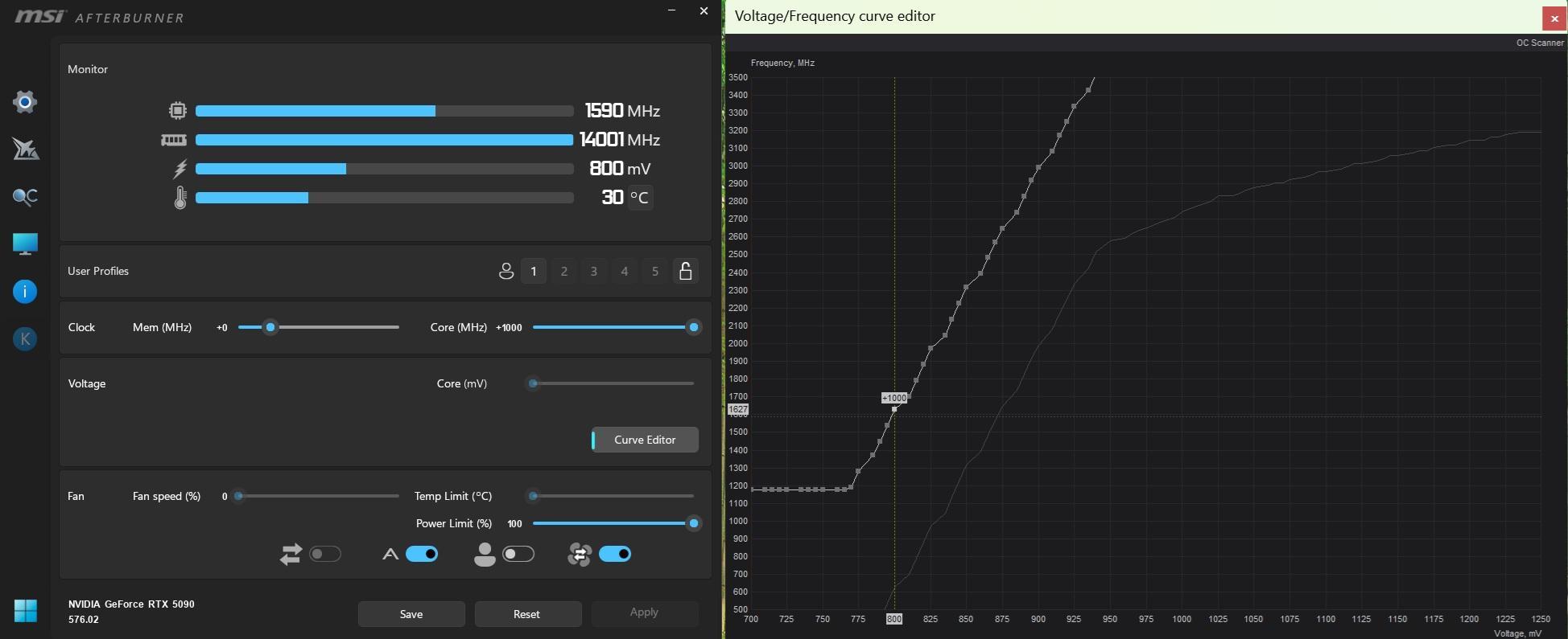 Wykres UV w okolicy ~3000Mhz i realnie mi boostuje 2805-2835Mhz+ w Cyberku przy napięciu 920-925mV. Jest stabilnie jak skała. Pobór to ~450-460W max - 4K max PT psycho, dlss Q i FGx2 (okolice 100fps+).