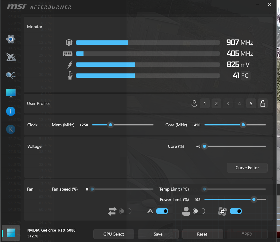 wlacz np cyberpunka, alt+tab, msi afterburner, ctrl+F i sprawdz napiecie dla danej aktualnej czestotliwosci a pozniej z shiftem w dol jakis klocuszek z nizszym napieciem, apply. A pozniej ten sam klocuszek wyzej (bez shifta) niz było w standardzie jesli o MHz chodzi i wyplaszczy Ci cala linie. To tak na start. Zakładam, że ciężko coś z tego zrozumieć ;)