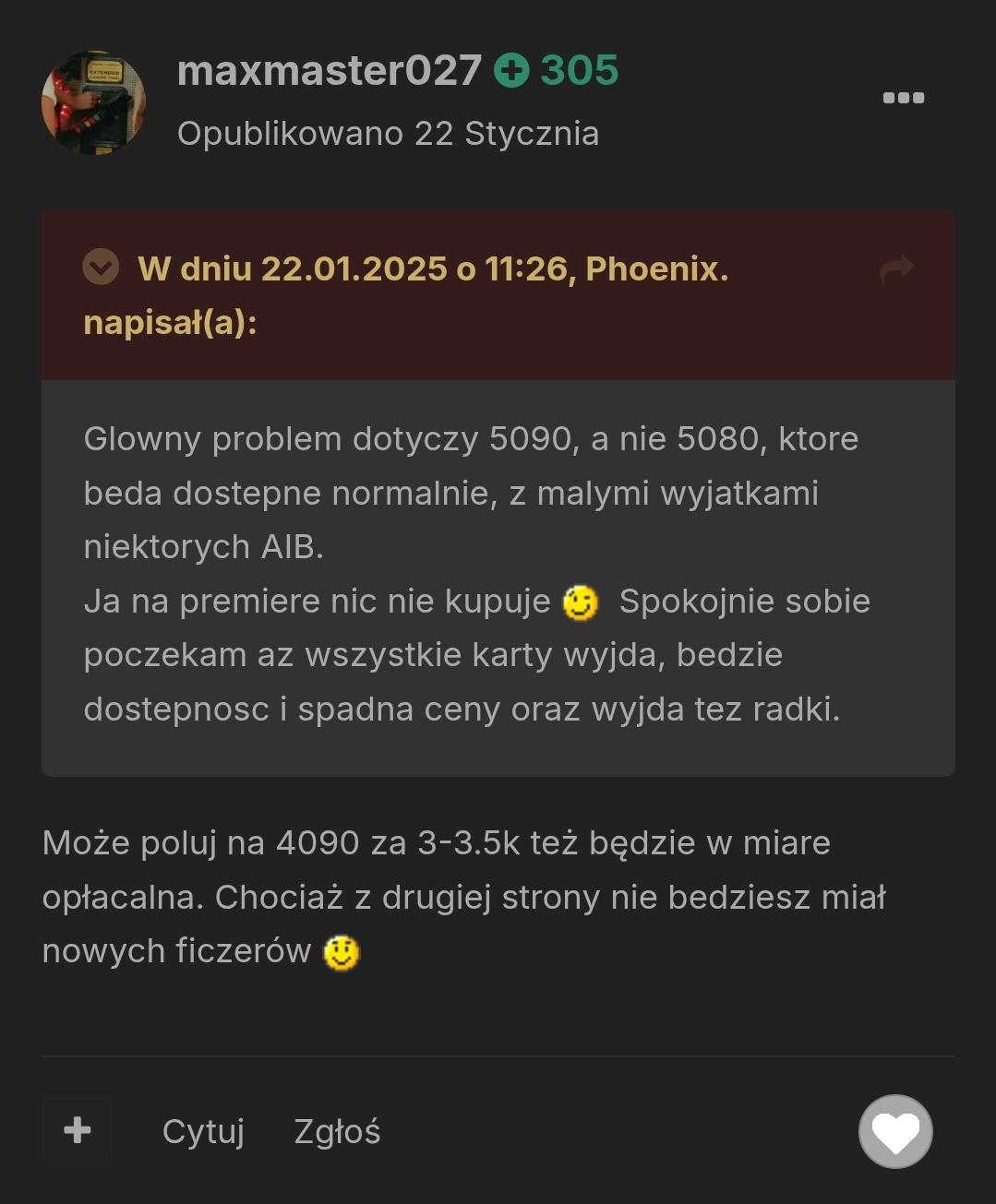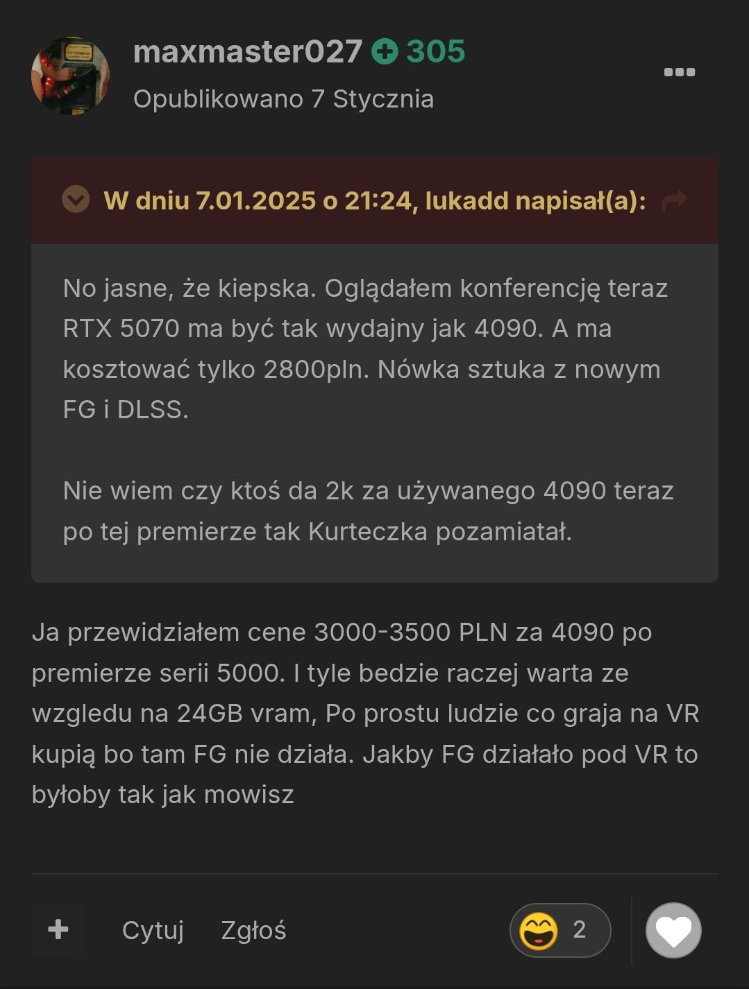 Dlatego cytat użytkownika który napisał, że 4090 zaraz będą po 3500 zł, powinien być u góry przyklejony na pamiątkę 😁😁😁😁