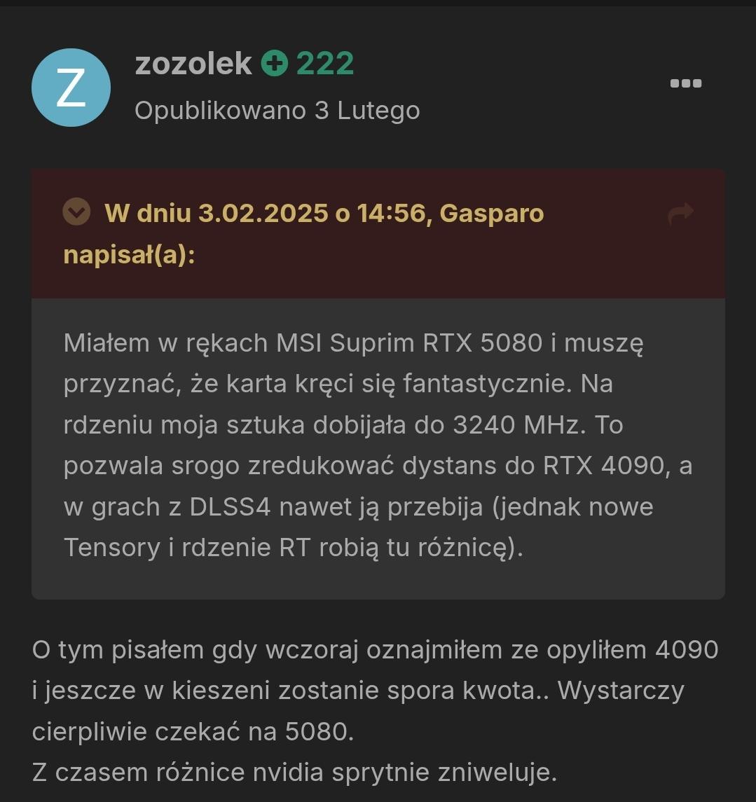 Pełna zgoda. Jeszcze ktoś puszcza famę, że tu ludzie ze stratą przeszli z 4090 na 5080 i oczywiście podłapanie tematu przez innych i festiwal spamu na całego. I tak w kółko i tak do uje...a :E