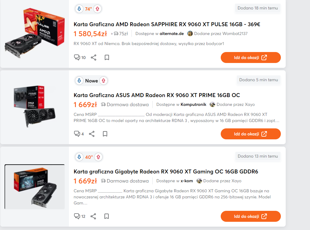 Widocznie promocyjna partia po MSRP się wyczerpała %-) Tak szczerze, to wygląda na to, że podobnie jak przy 9070 i 9070 XT, MSRP jest fałszywe (przynajmniej na Polskę) i tylko skromna pula kart przyszła w sugerowanej cenie.