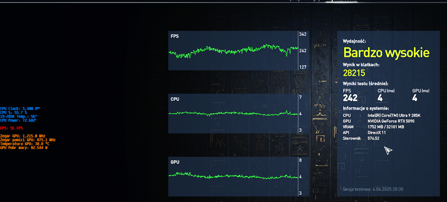 285k 9000    - 166 fps / 142 fps min / 201 fps max / 147 fps niskie 0.5%