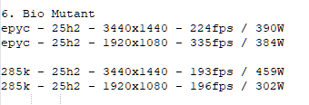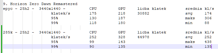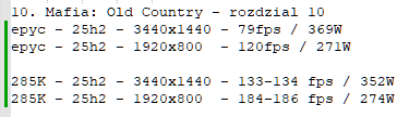 Same testy graficzne w tym Wieśku porobiłeś, szkoda czasu Twojego na nie ;) Natomiast w Cyberpunku 9950X3D jest tylko o ok. 8% szybszy od nietuningowanego 285K, dlatego nic dziwnego, że po mocnym podbiciu NGU/D2D masz podobną wydajność na obu CPU.