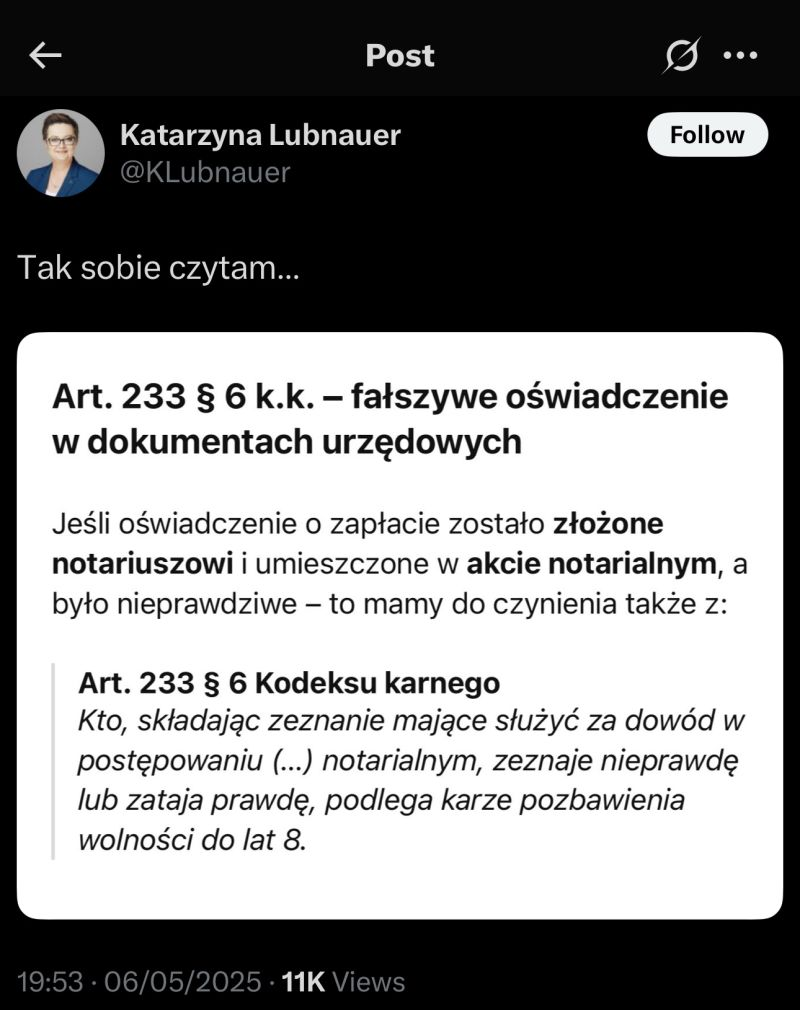 @Wu70 Proszę bardzo, dokładna treść przepisu art. 233 § 6 kodeksu karnego to: