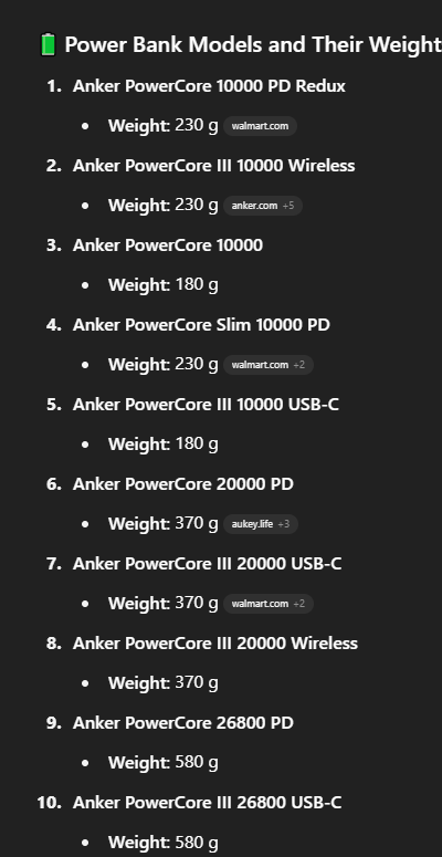 Najpierw GPT mi powiedział, które marki są polecane pod kątem jakości, potem dał info ile Watt potrzebuję do Questa 2 lub 3, po czym się zrobiło ok 15-20 model z pewnie 50, a na koniec pięknie mi wylistował każdy model, podając jego wagę.