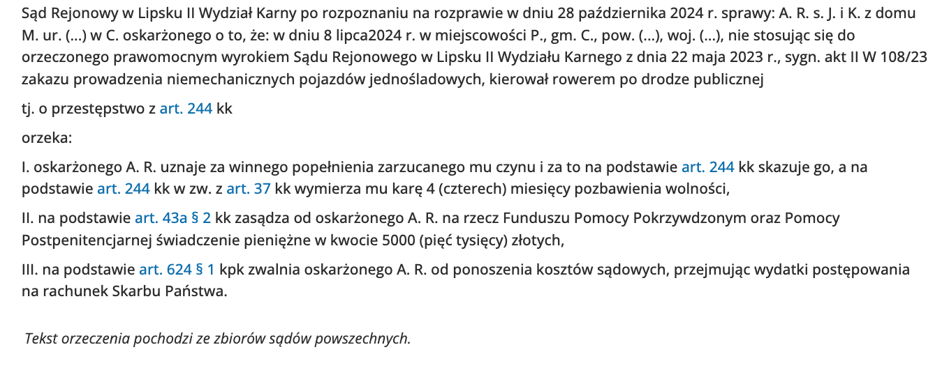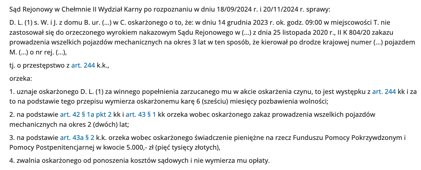 GordonLameman 8 423 Opublikowano 6 Stycznia Opublikowano 6 Stycznia (edytowane) Ten brak przepływu może mieć znaczenie przy 2-3 zakazach, ale nie przy 14. Administracyjna część sądów od wielu lat szwankuje, ale też ta pobłażliwość dla chocby tego wyżej - młodociany z zakazem zanim dostał prawo jazdy, zakaz złamany i dostaje grzywnę, którą zapłacą za niego rodzice. Co to za kara? A teraz zestawmy to z np. zakazem jazdy rowerem, za którego naruszenie ktoś dostał 4 miesiące pozbawienia wolności: Ale może coś się rusza, bo tu jest nadzieja, 6 miesięcy BZ: Edytowane 6 Stycznia przez GordonLameman