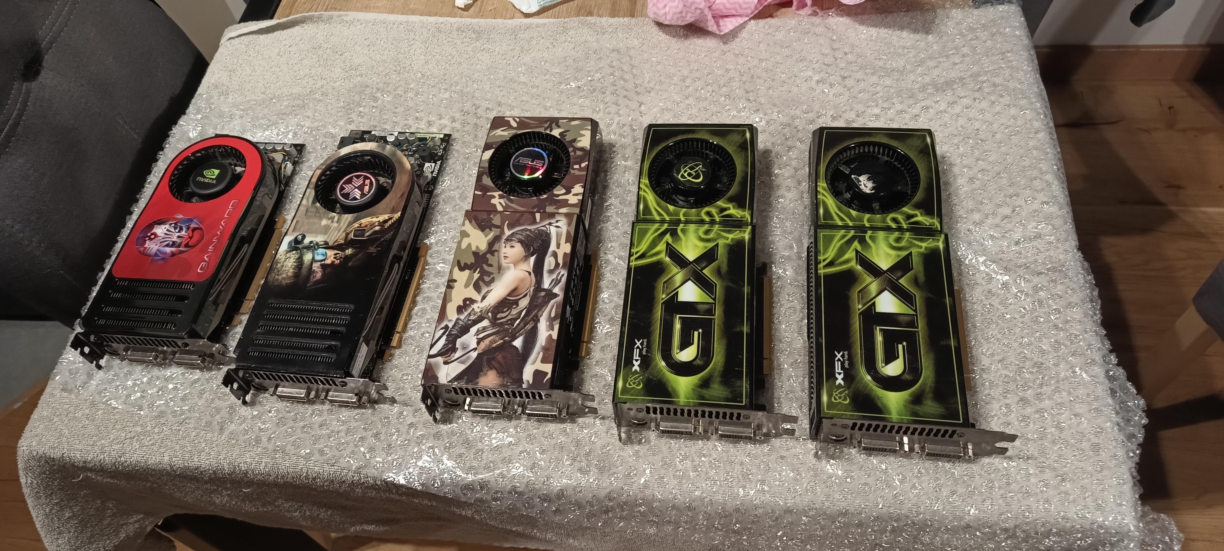 Karty wizualnie są dosyć porysowane, wszystkie GTX2xx miały śledzie do prostowania (kupiłem wszystkie od jednego sprzedającego) dodatkowo 8800GTS jest trochę krzywa.